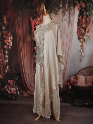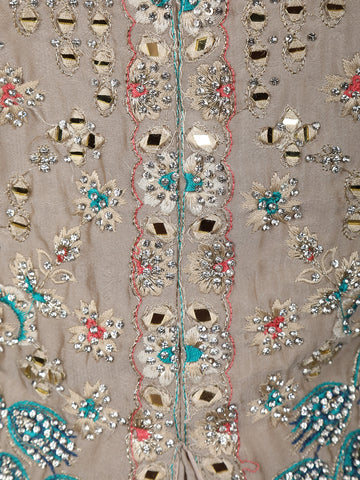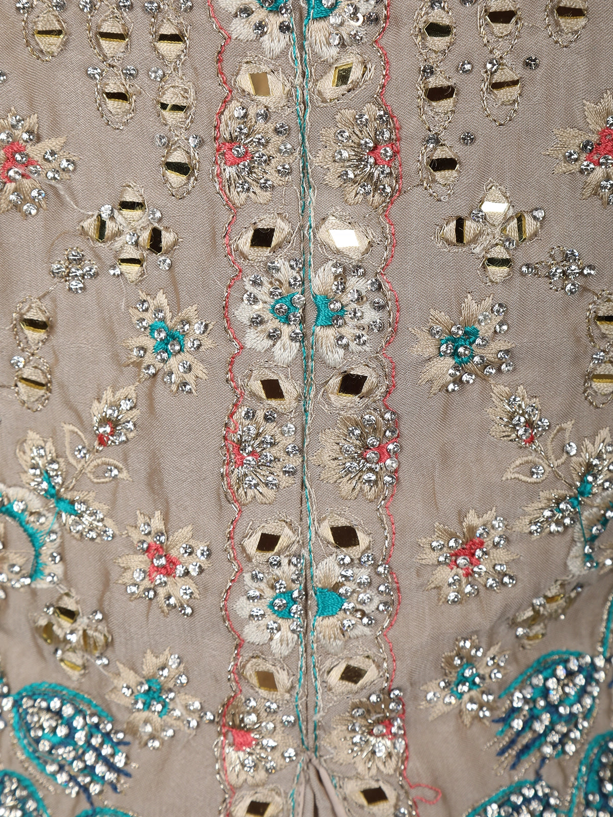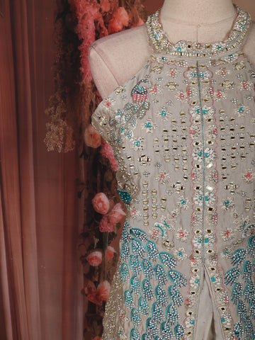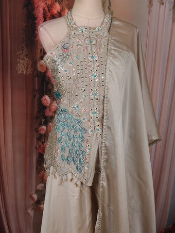 The kurti is exquisitely adorned with peacock-inspired stone embellishments and delicate beadwork, arranged in elegant patterns that add depth and artistic flair. Subtle pastel-toned accents enhance the peacock motifs, lending a hint of colour while preserving the sophisticated ivory palette. The neckline is finely detailed with coordinated stones and beads, creating a polished and regal finish.