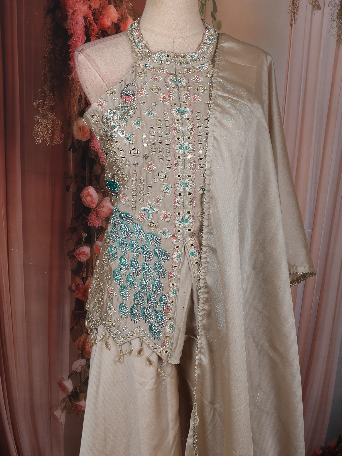 Ivory Peacock Stone Embellished and Beads Design Georgette Palazzo Suit with Dupatta