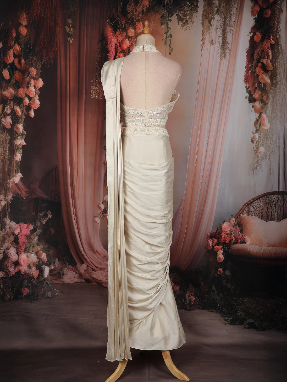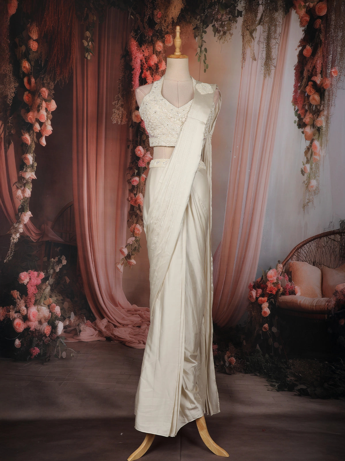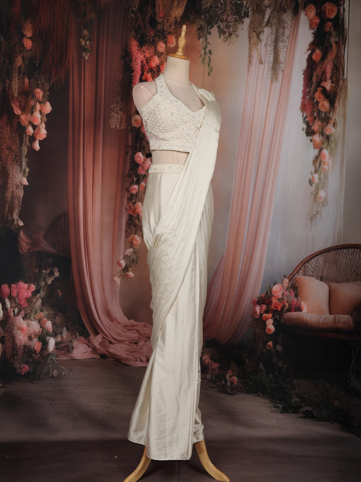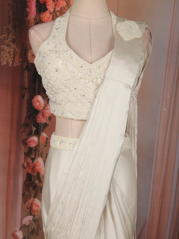 Ivory Pearl and Sequins Embroidered Satin Ready-to-Wear Saree with Designer Blouse
