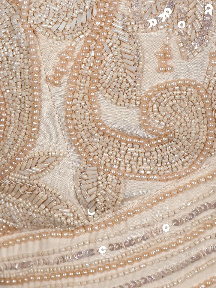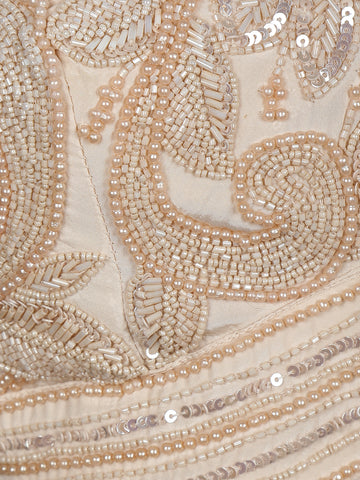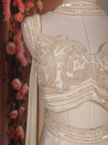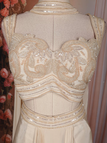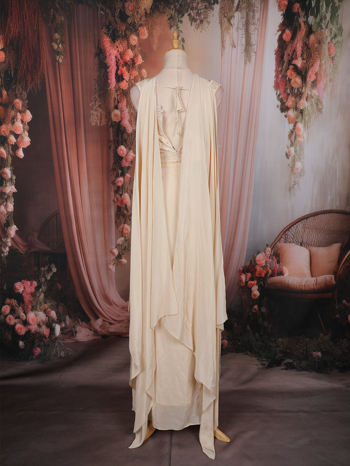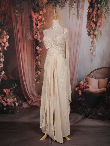 The satin skirt cascades beautifully with soft drapes, creating a fluid silhouette that flatters every movement. Its refined pearl-ivory tone makes it an ideal pick for receptions, sangeet nights, cocktails, and stylish evening gatherings.