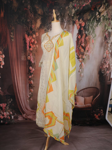 The look is completed with a lightweight chiffon dupatta featuring multicolor geometric prints in hues of orange, yellow, and green — perfectly balancing the simplicity of the kurta with a splash of vibrancy. Ideal for festive gatherings, cultural events, and family functions, this ensemble is a symbol of understated luxury.