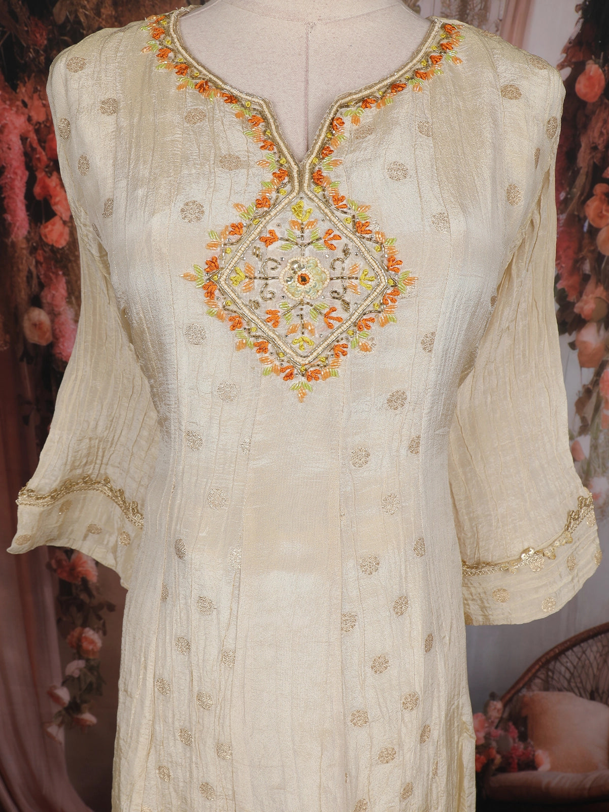 The kurta features intricate thread and mirror embroidery on the yoke, forming a floral-inspired motif that adds a subtle sparkle to the serene ivory base. The notched round neckline and 3/4 flared sleeves enhance the ethnic appeal, while the Anarkali silhouette flows beautifully to create a flattering, feminine drape.