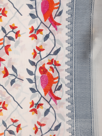 The ivory white base is beautifully enhanced with vibrant red bird and floral prints, delicately arranged along intertwining vine motifs. Subtle grey stems and leaf details add balance and depth, while the contrasting printed border lends a neat, refined finish to the overall design. The lively red accents stand out gracefully against the serene ivory backdrop, creating a charming visual appeal.