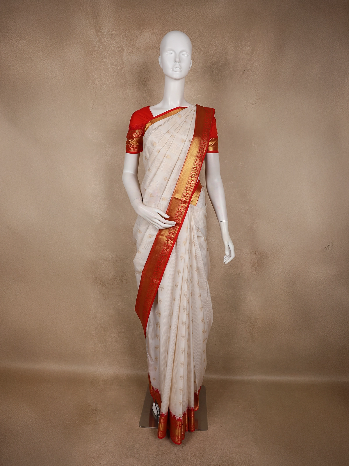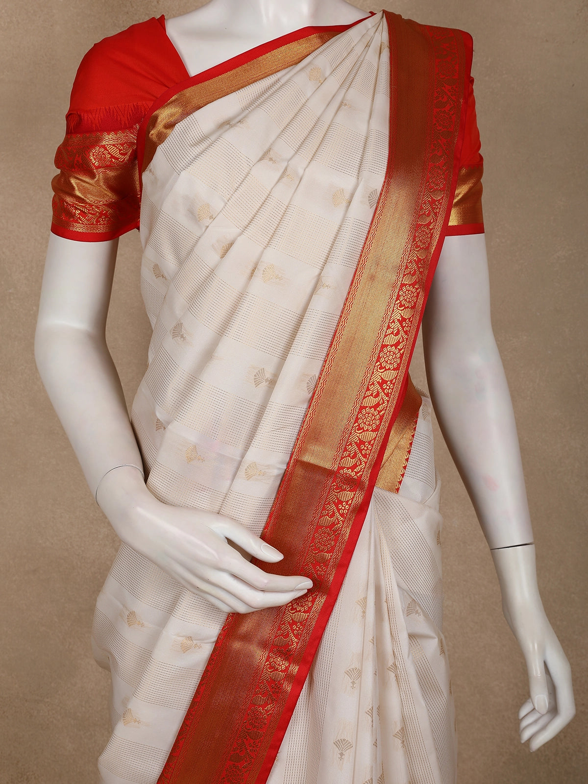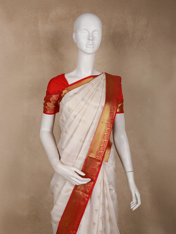 The serene ivory white base is delicately adorned with subtle woven butta motifs, adding a refined texture and classic appeal. A striking contrast vermilion red border enhanced with gold zari detailing frames the saree beautifully, lending a vibrant and auspicious touch. The coordinated red blouse with zari accents completes the ensemble with timeless sophistication.