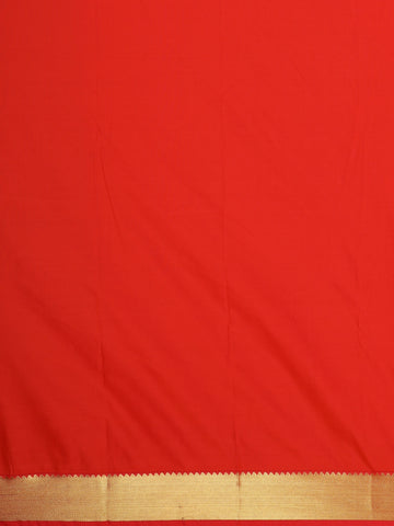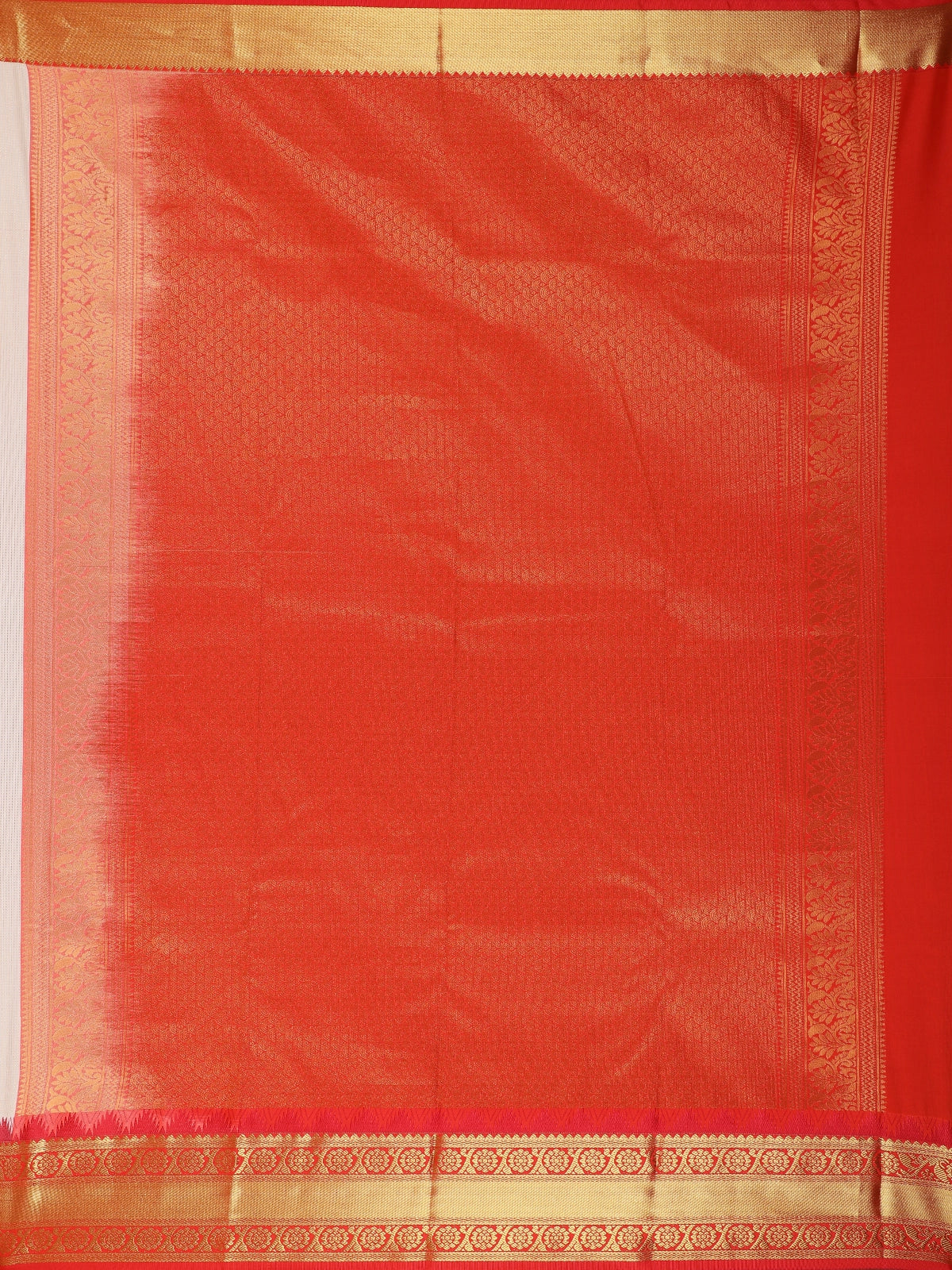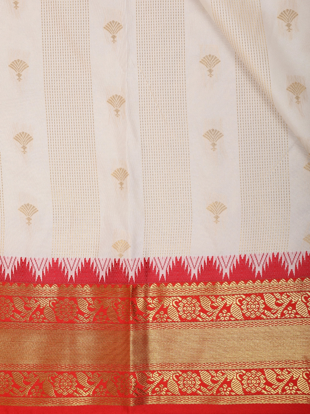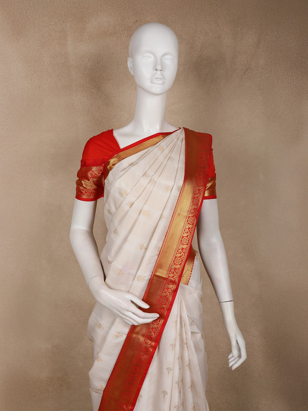 The serene ivory white base is delicately adorned with subtle woven butta motifs, adding a refined texture and classic appeal. A striking contrast vermilion red border enhanced with gold zari detailing frames the saree beautifully, lending a vibrant and auspicious touch. The coordinated red blouse with zari accents completes the ensemble with timeless sophistication.