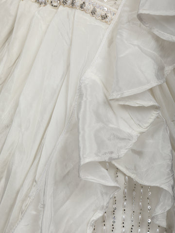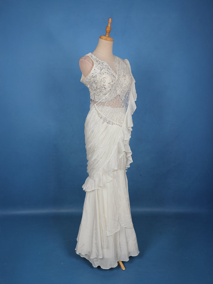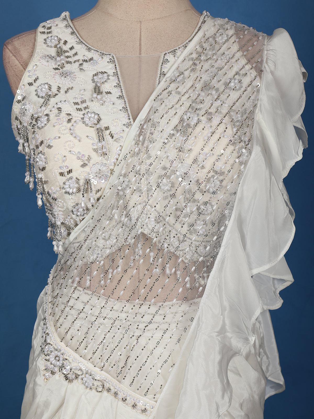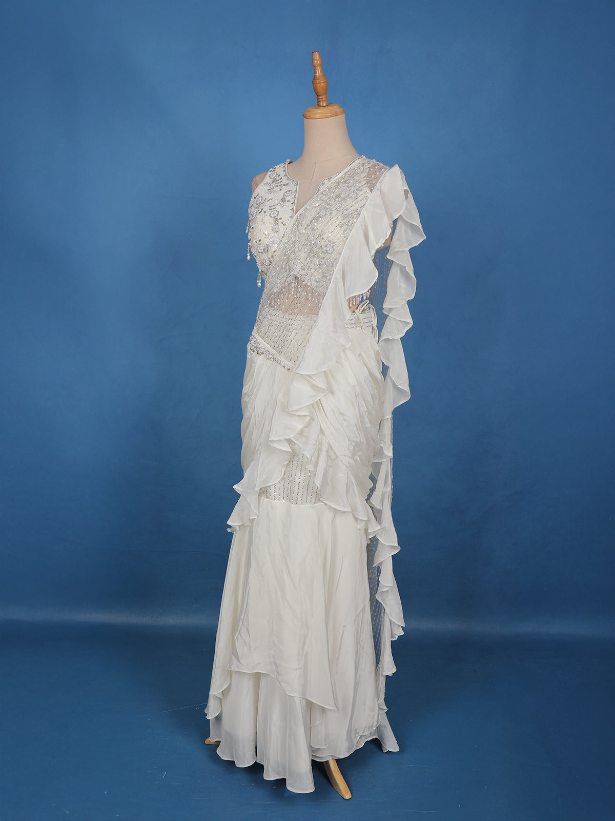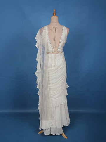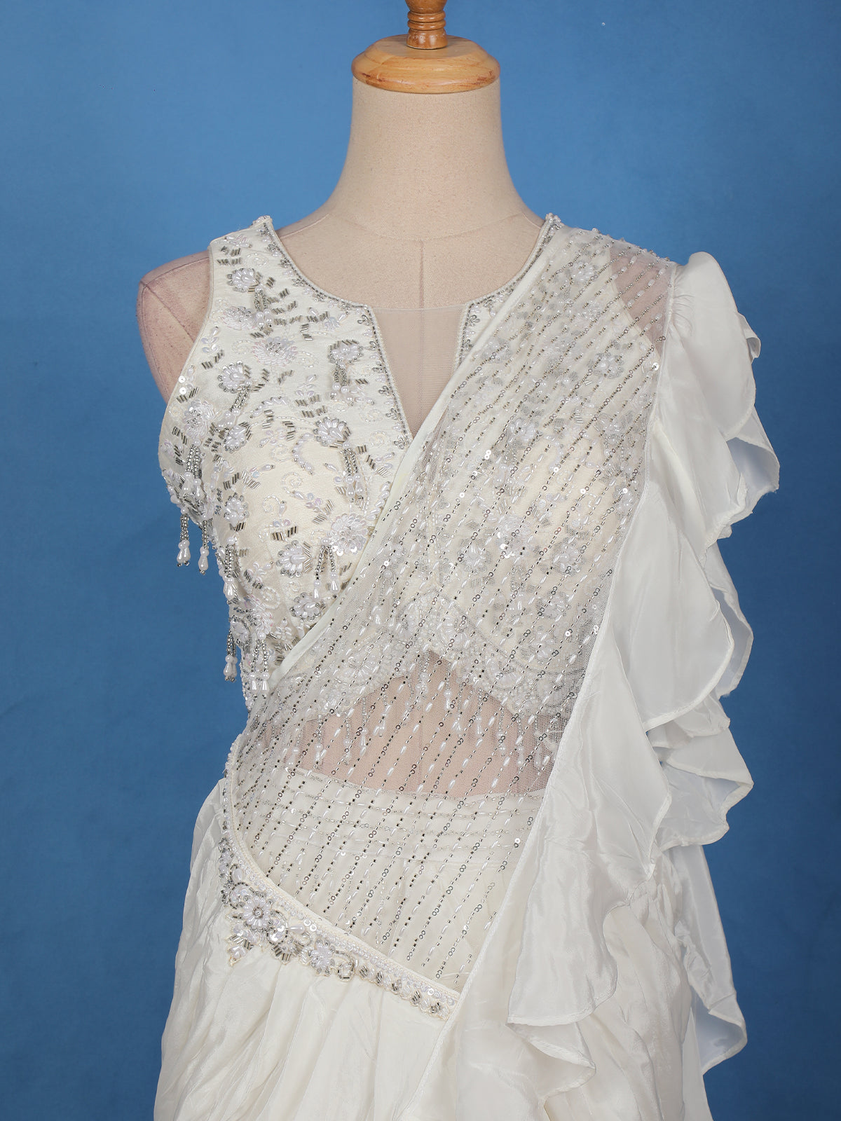 Ivory White Embroidered Georgette Ready To Wear Ruffle Saree With Sequin Work Blouse