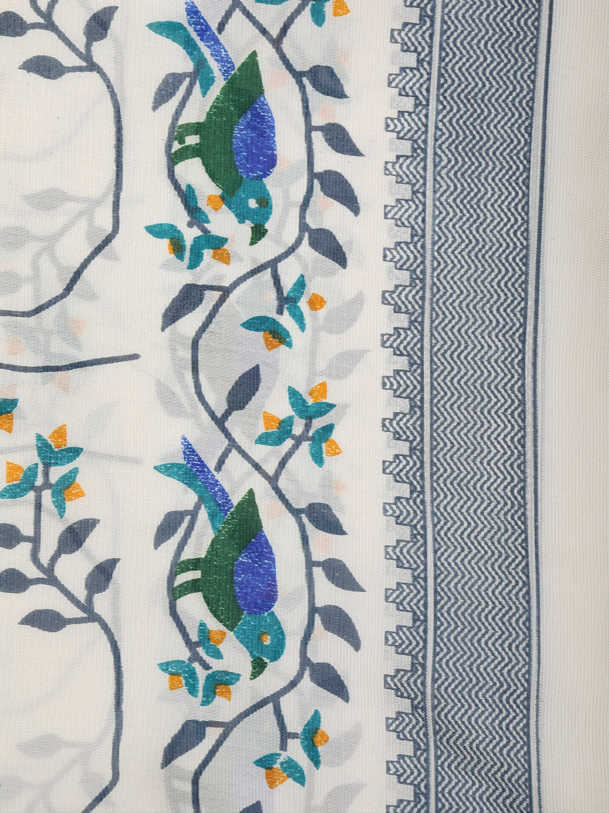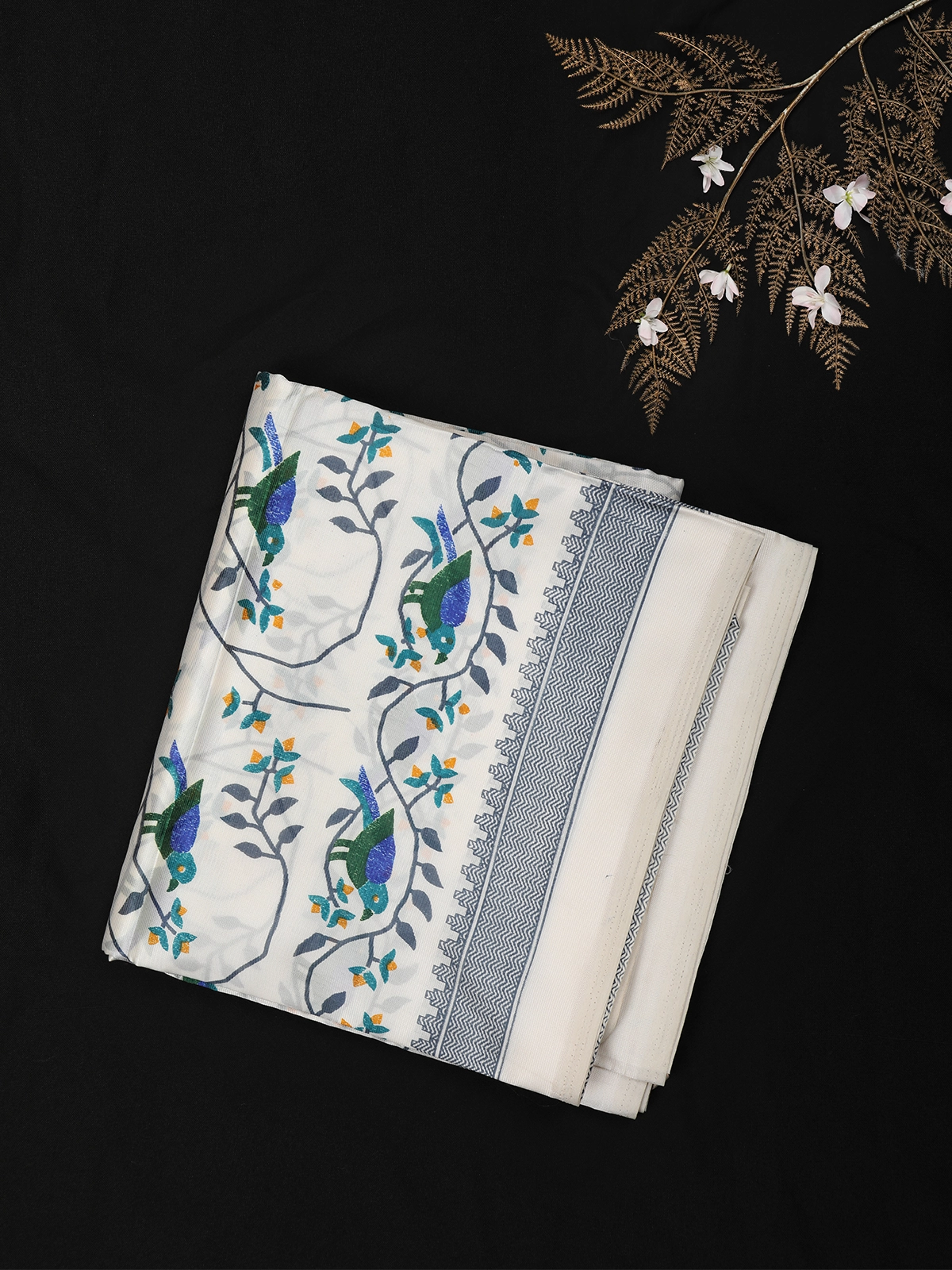Gracefully elegant and effortlessly stylish, this Ivory White crepe silk saree showcases a refined blend of minimal charm and artistic detailing. The soft ivory white base lends a clean, soothing appeal, beautifully accentuated with delicate floral creeper patterns and charming bird motifs in refreshing hues of teal green, peacock blue, soft grey, and hints of mustard.