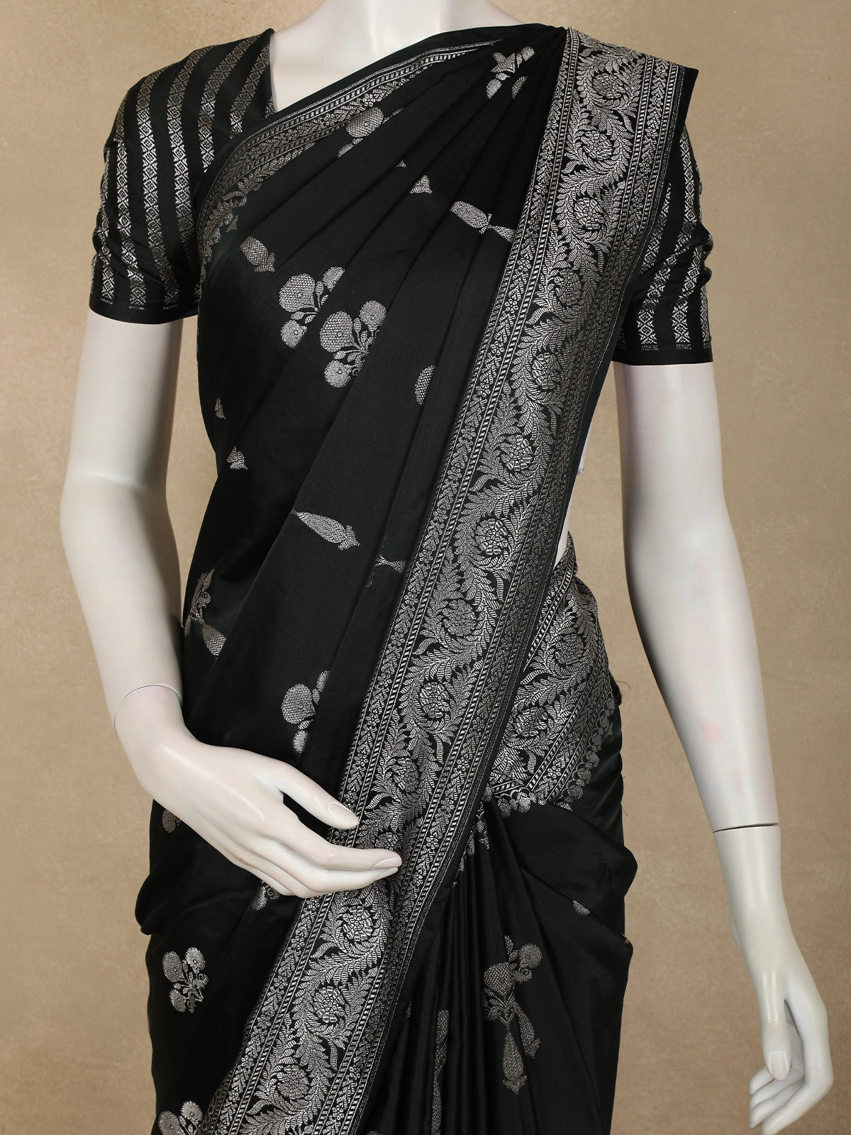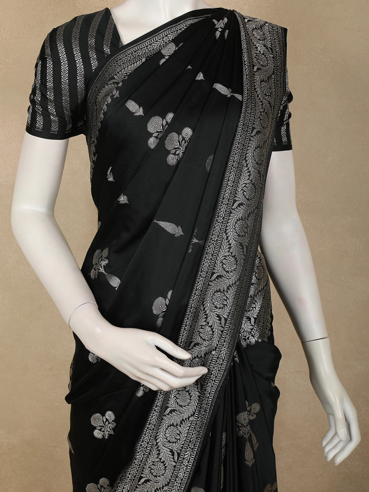Timeless, elegant, and effortlessly regal, this Jet Black Floral Zari Woven Design Pure Banarasi Silk Saree with Zari Border is a statement of classic sophistication. The deep jet black base is beautifully enhanced with delicate silver zari floral butta motifs, creating a refined contrast that exudes understated luxury.