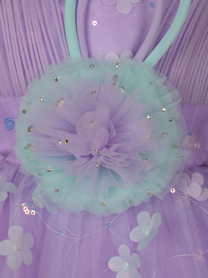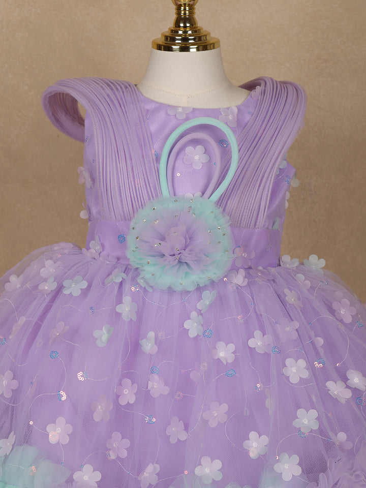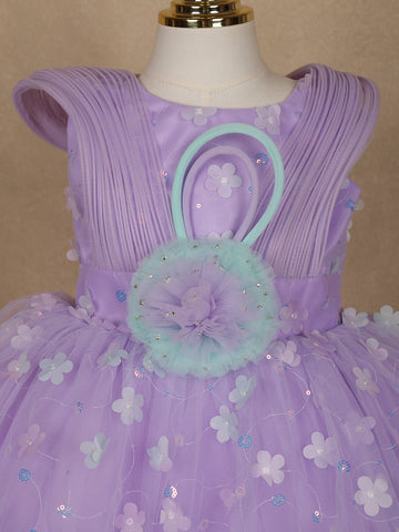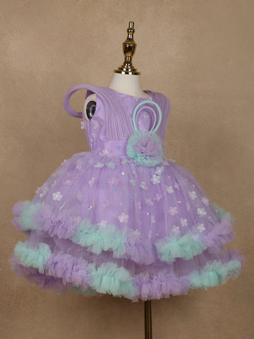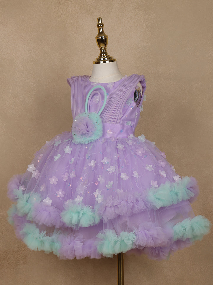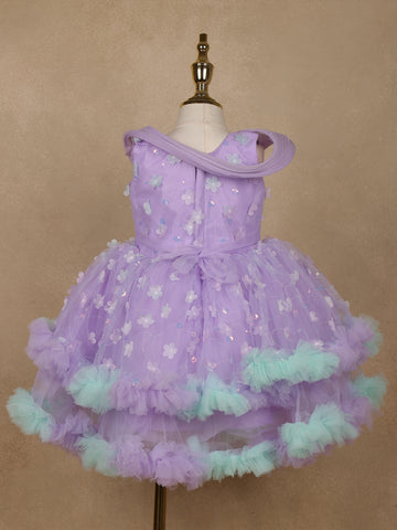 Give your little one a princess makeover with this enchanting Lavender 3D Floral Layered Party Frock. Crafted from fine satin and layered net, it showcases dainty floral appliqués and sparkling sequin detailing that glimmer with every twirl. The voluminous flare is beautifully finished with soft aqua ruffle trims, adding a dreamy contrast to the pastel lavender tone. A tulle flower brooch adorns the front, while the pleated shoulder loops lend a royal touch. Perfect for birthdays, celebrations, and festive occasions, this frock combines elegance and comfort for an effortlessly adorable look.