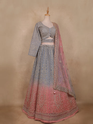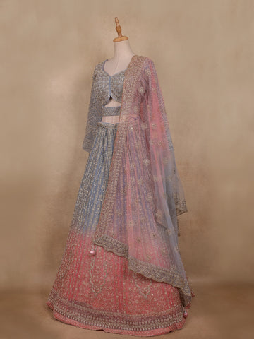 Indulge in ethereal elegance with this Lavender and Pink Ombre Sequins Embroidered Net Lehenga with Dupatta, a masterpiece that reflects modern bridal luxury and timeless charm. Crafted from premium net fabric, this lehenga radiates a captivating ombré transition from soft lavender to blush pink, adorned with intricate sequin and zari embroidery that sparkles with every movement.