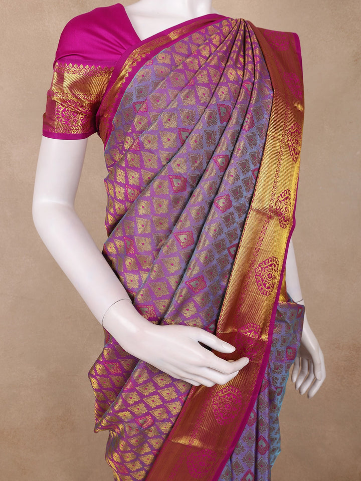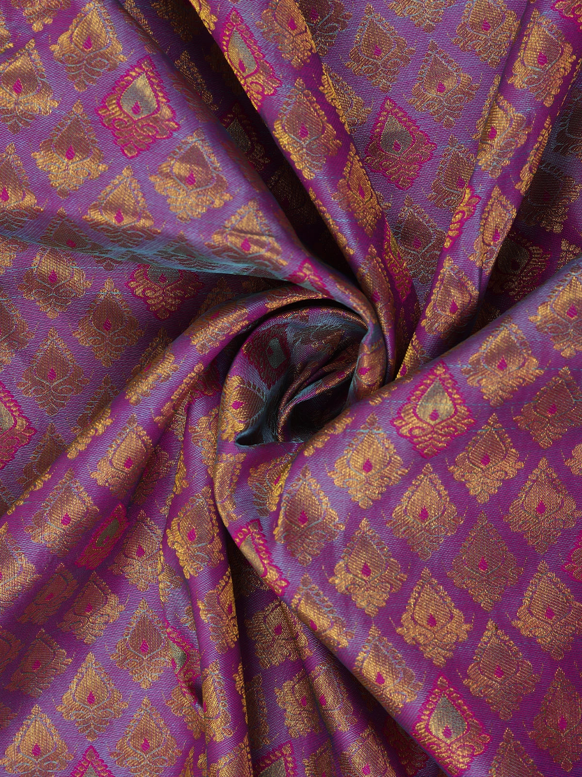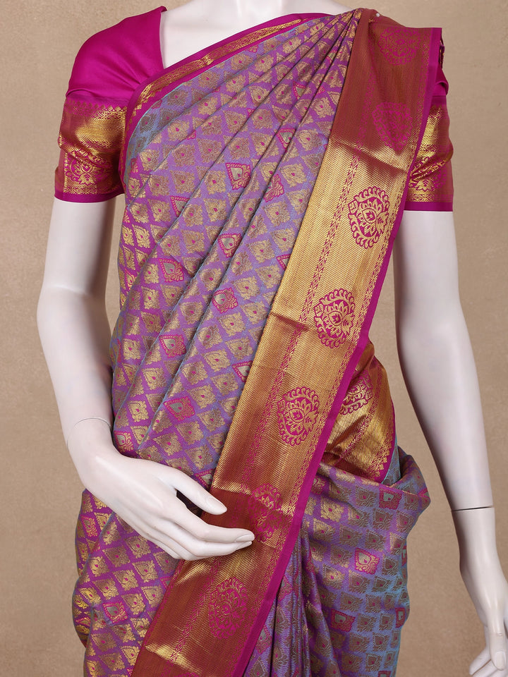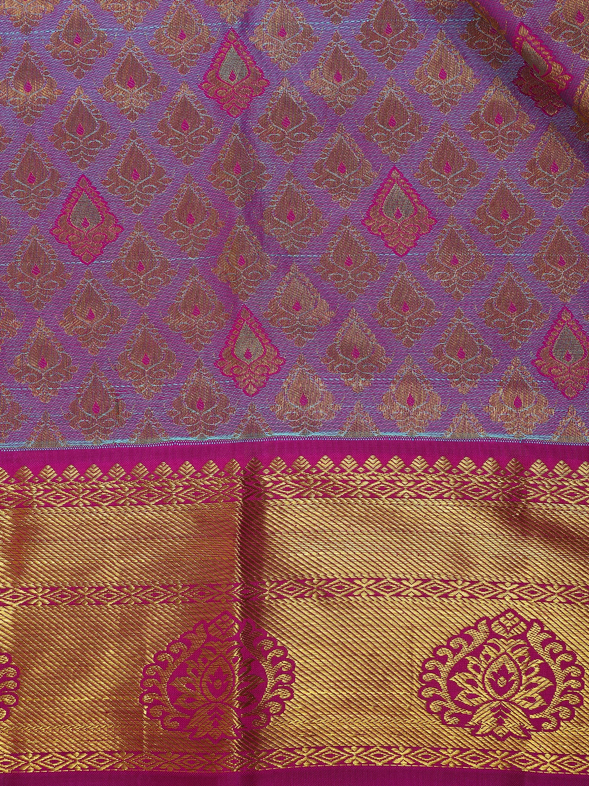 Emanating regal grace, this Lavender Butta Woven Kanchipuram Silk Saree is a masterpiece of craftsmanship and color harmony. The luminous lavender base is adorned with intricate gold and magenta woven buttas, creating a mesmerizing interplay of sheen and sophistication. The rich gold zari border and contrast pink pallu enhance the saree’s traditional splendor, making it a timeless ensemble for grand occasions.