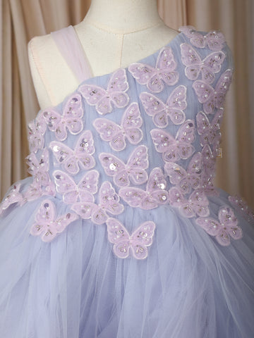 Make your little princess look like a dream in this enchanting Lavender Butterfly Layered Net Ruffle Frock, designed to bring magic to every celebration. Crafted from soft net fabric, this frock features a stunning one-shoulder neckline that adds a chic and elegant charm. The bodice is adorned with 3D butterfly appliqués and delicate sequin work, creating a sparkling, fairy-like appeal that’s perfect for birthday parties and festive occasions.