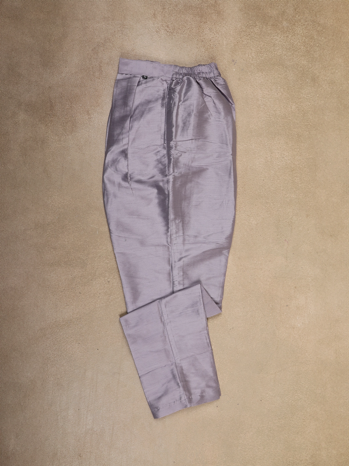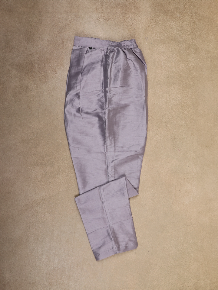 Dress your young prince in refined sophistication with this Lavender Diamond Woven Design Jacquard Sherwani Suit with Brooch, crafted to make every special occasion unforgettable. The sherwani is tailored from premium jacquard fabric featuring an exquisite all-over diamond woven pattern that adds depth, texture, and a shimmering finish to the soft lavender tone. The fabric’s subtle sheen enhances the overall elegance, giving the outfit a royal charm ideal for weddings, receptions, festivals, and grand celebrations.