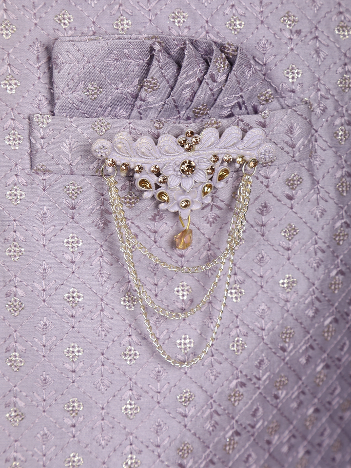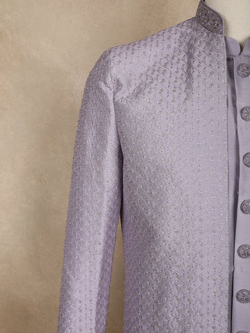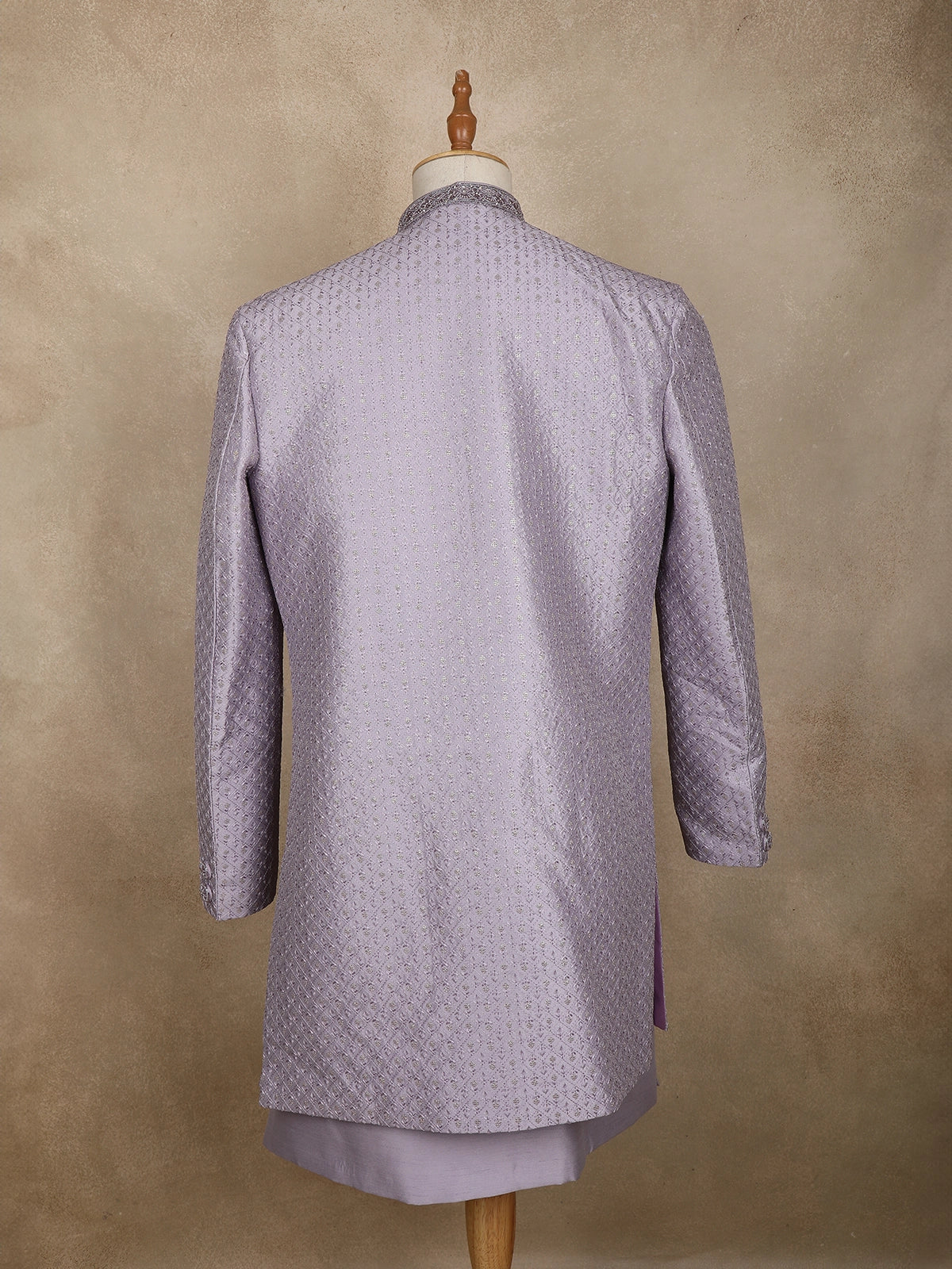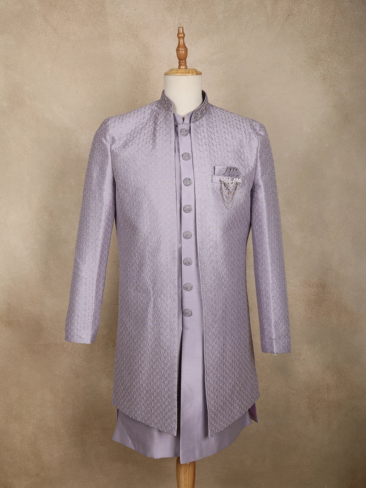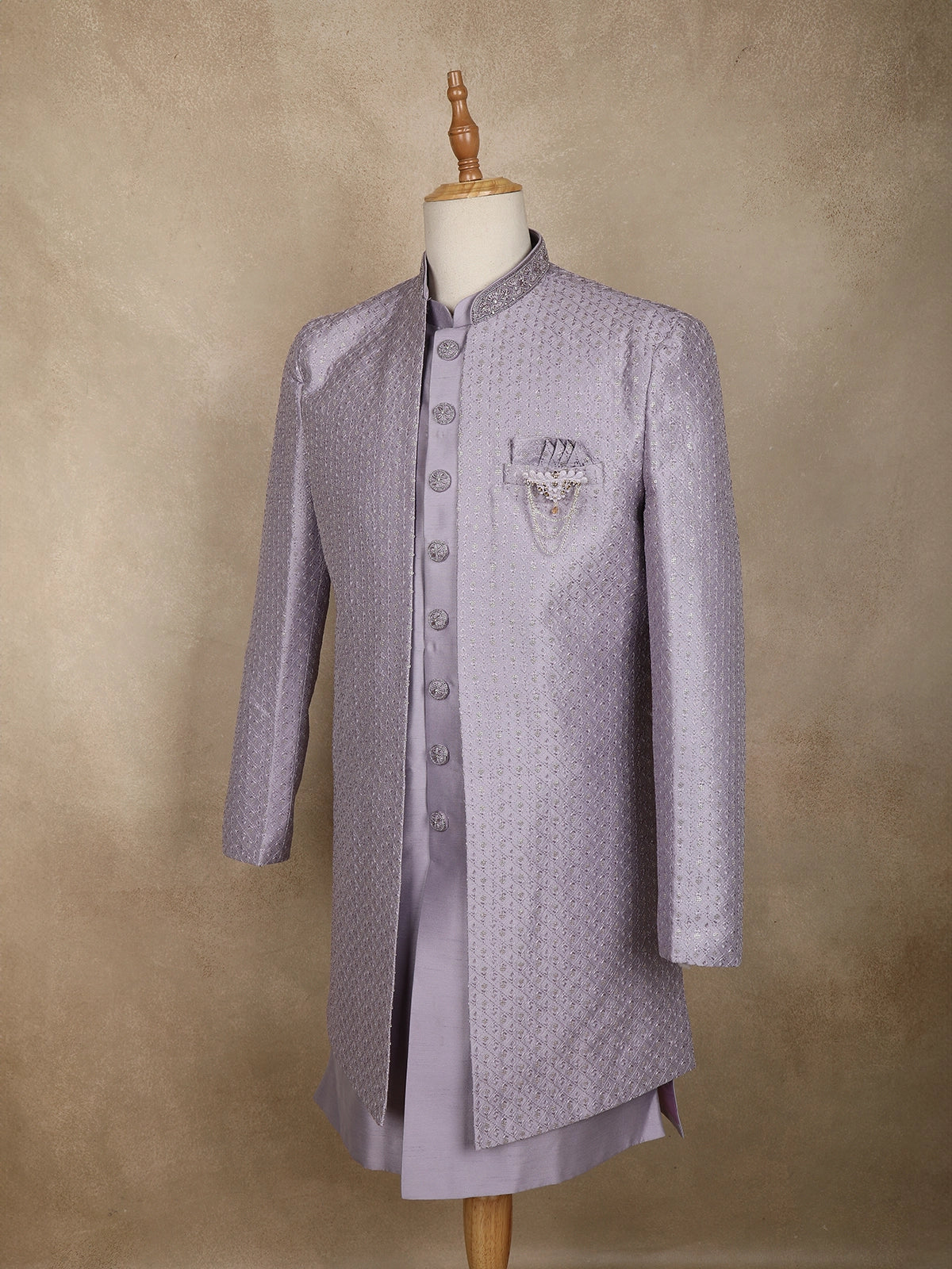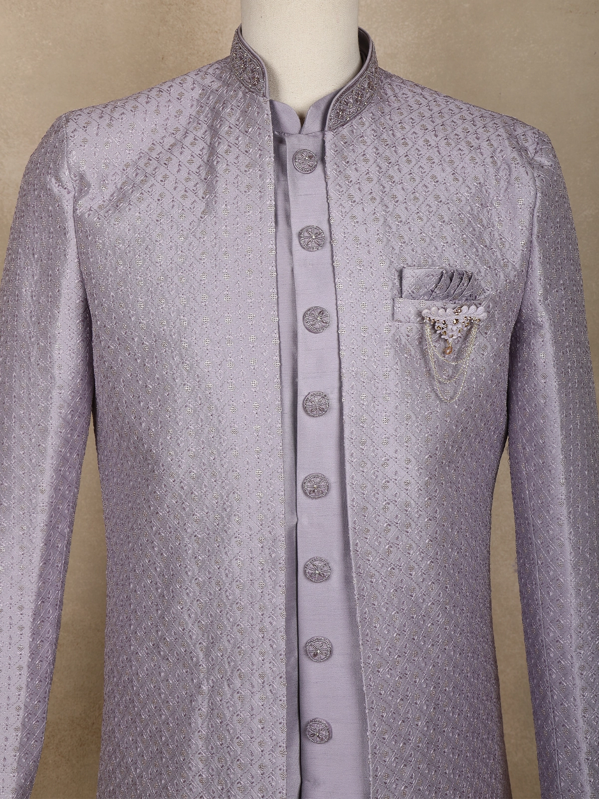 Lavender Diamond Woven Design Jacquard Sherwani Suit with Brooch