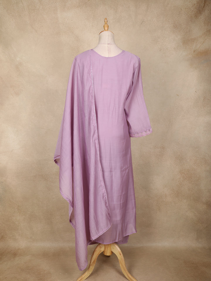 Elevate your wardrobe with this charming lavender cotton salwar suit that merges comfort and feminine elegance. The full-length kurta features graceful scallop lace edging along the neckline and borders, giving it a handcrafted appeal.