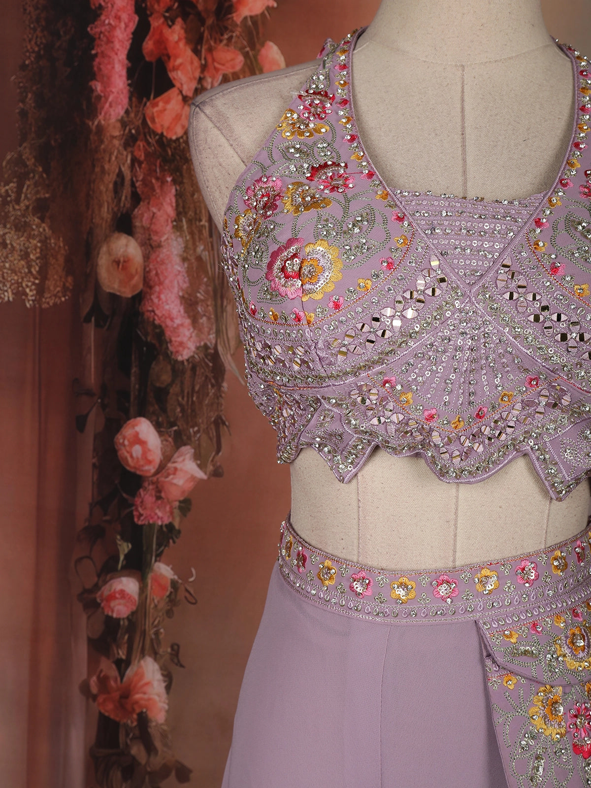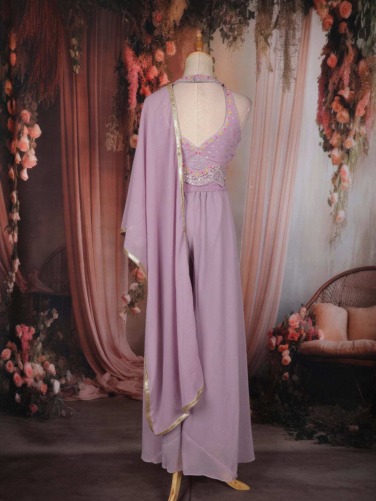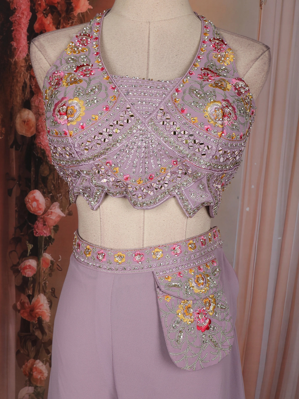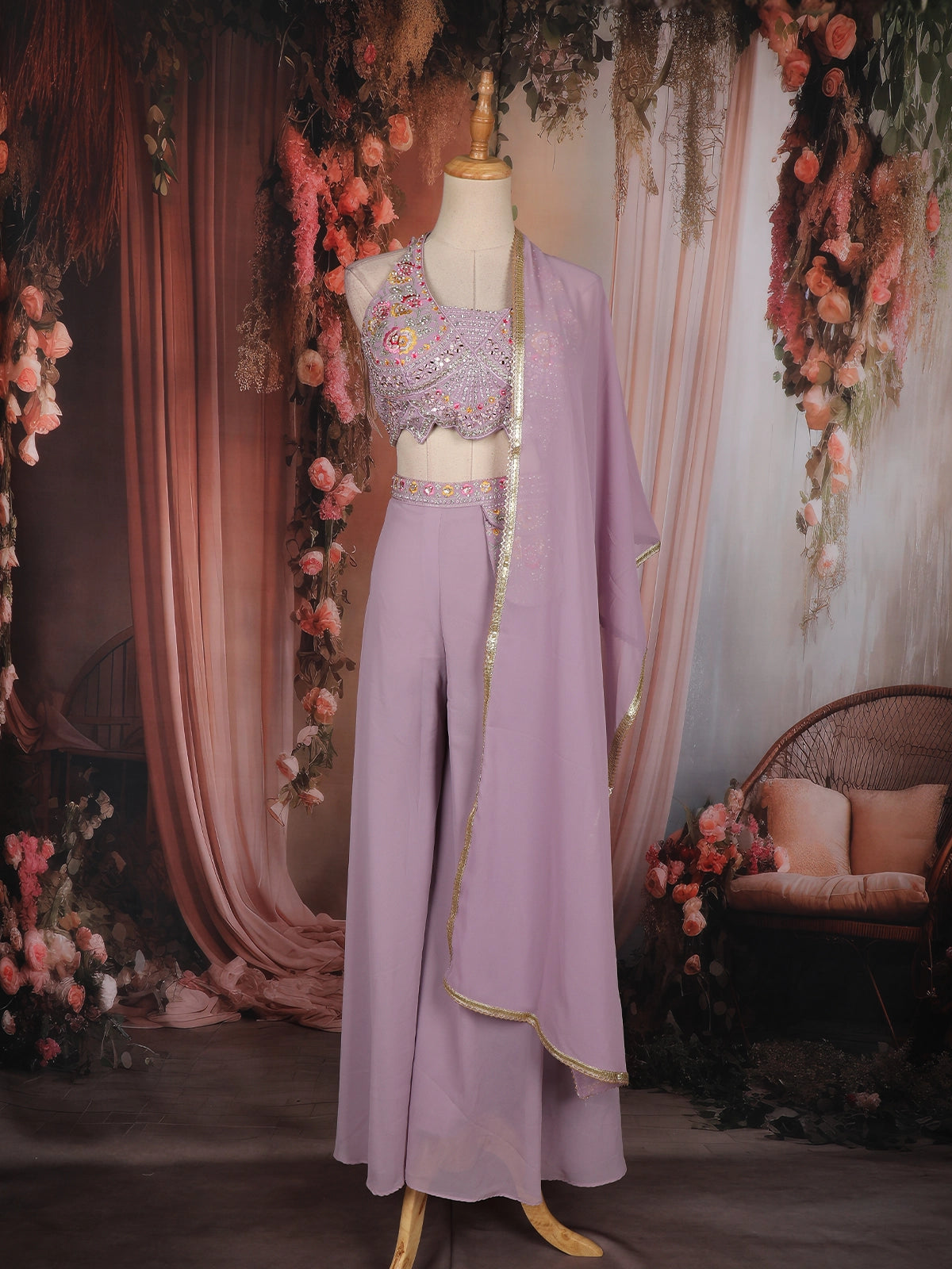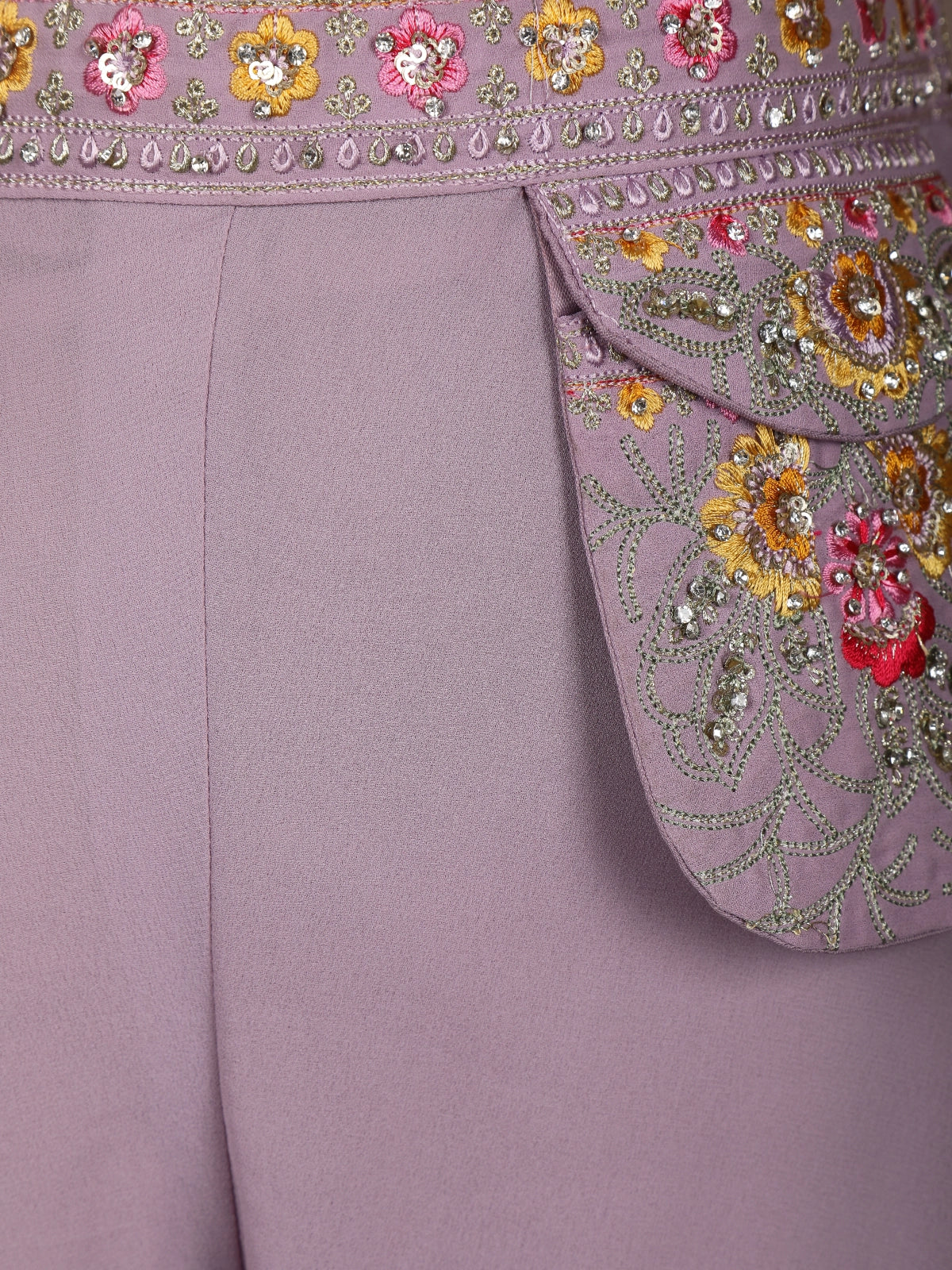 This lavender palazzo suit is a graceful blend of elegance and modern festive style. Crafted in soft georgette fabric, the outfit features a beautifully embellished sleeveless top highlighted with delicate floral embroidery, sequins, and fine bead detailing that adds a subtle shimmer. The coordinated embroidered waistband enhances the overall look while giving a neat, polished finish.
