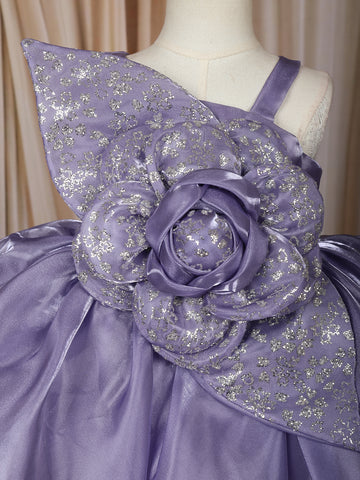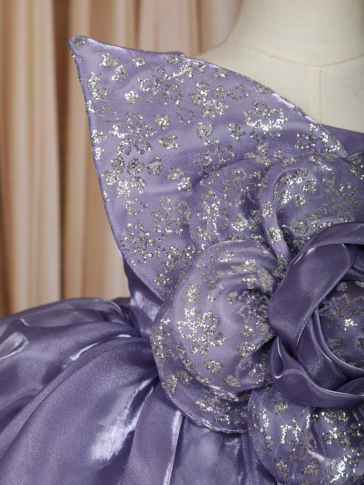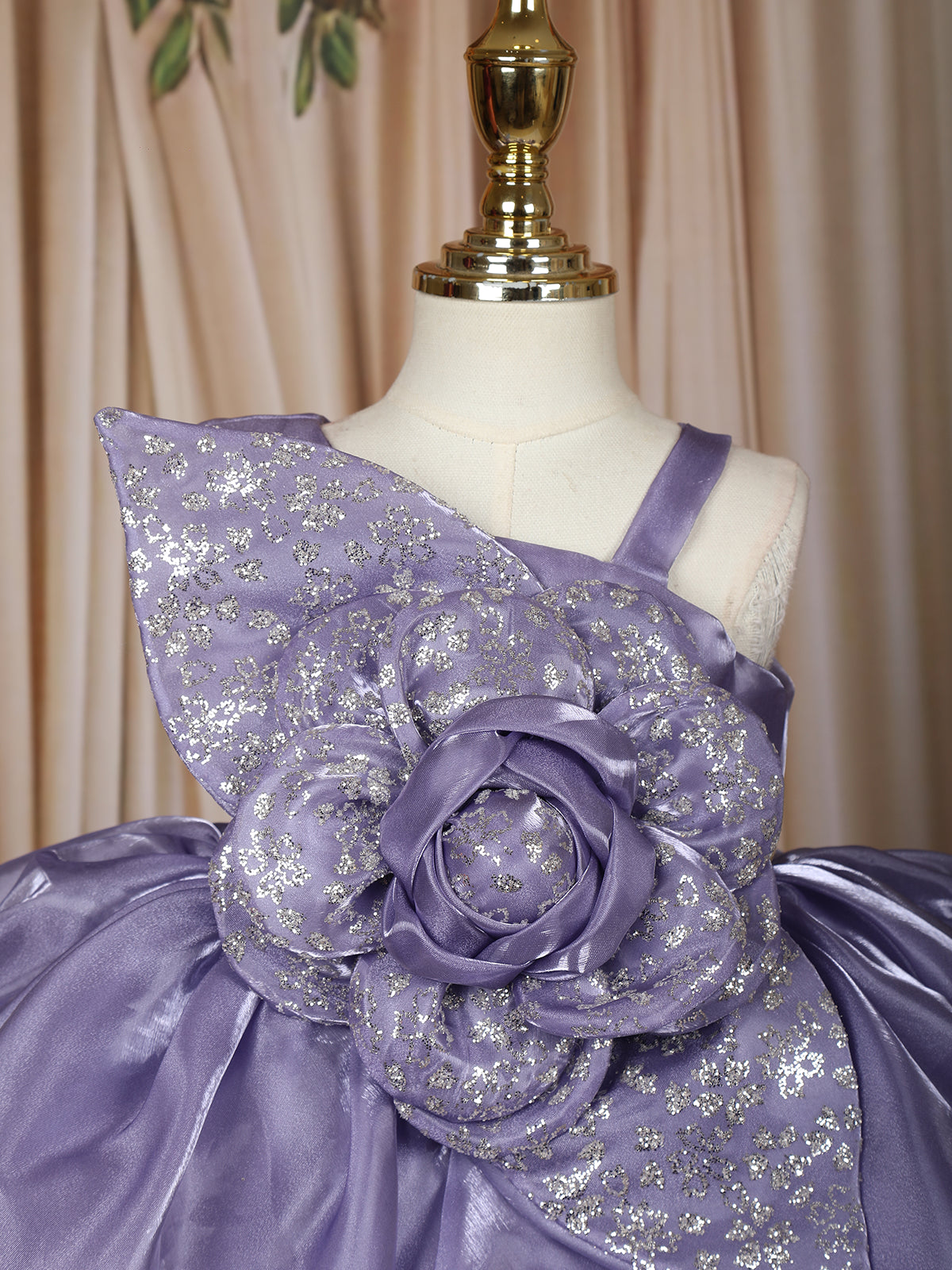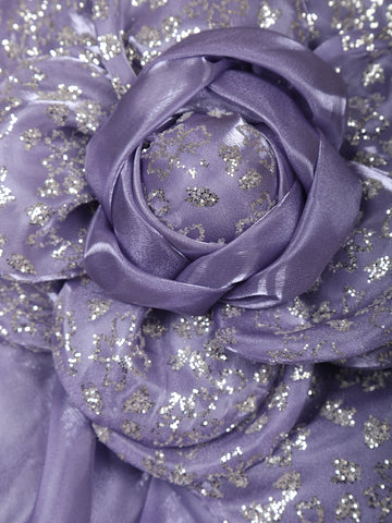 The highlight of this exquisite frock is the oversized 3D floral appliqué adorning the bodice — delicately crafted with satin petals and intricate sequin embellishments for a sparkling, festive finish. The addition of subtle glitter highlights adds a glamorous shimmer, perfect for birthdays, weddings, or evening parties.