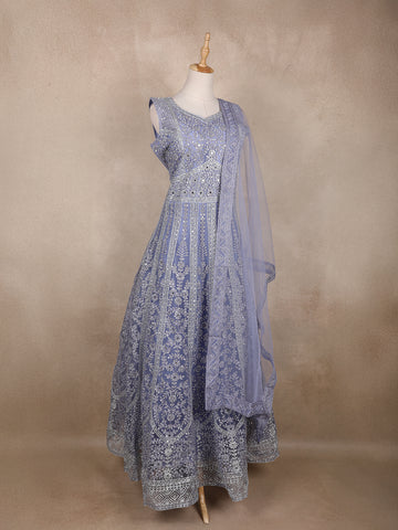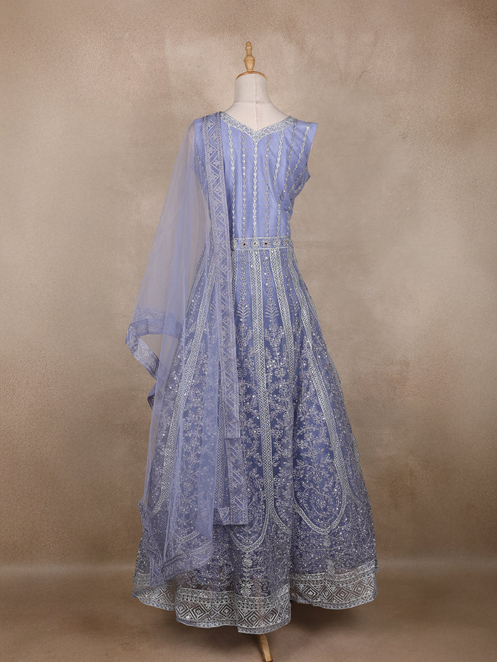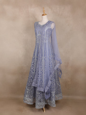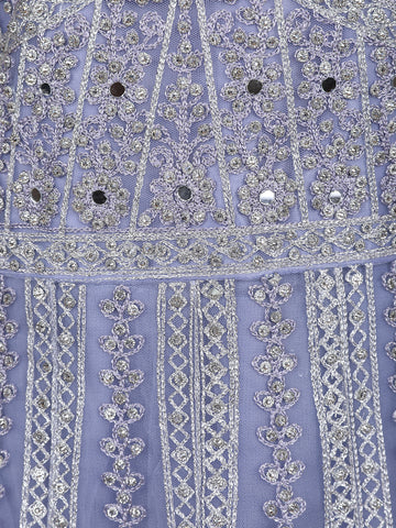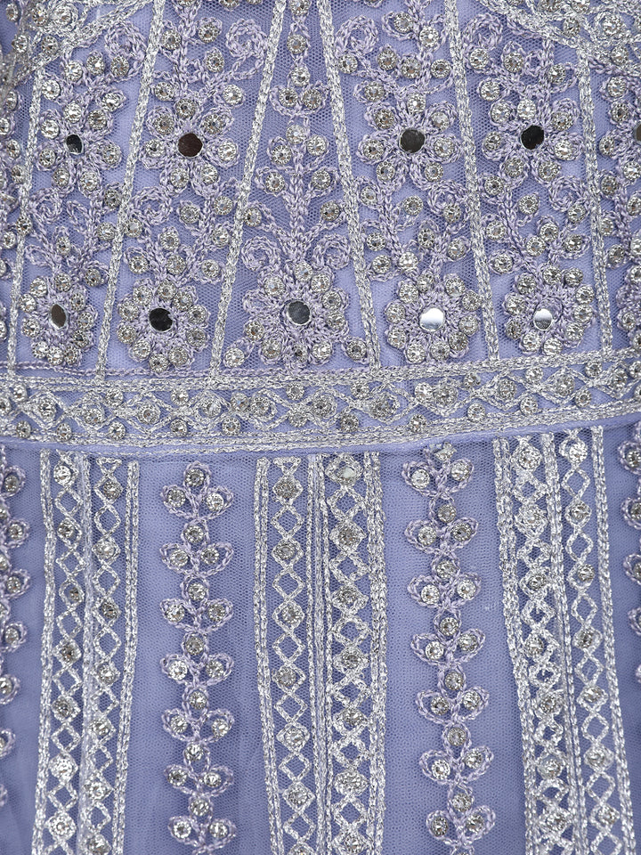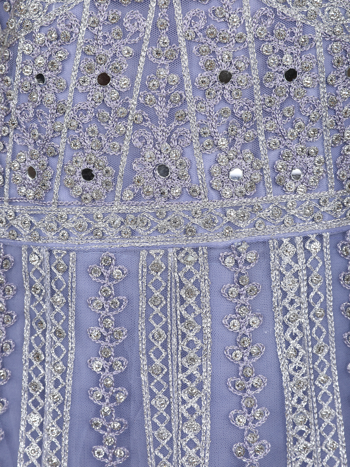 Radiate elegance and poise with this Lavender Floral Embroidered Net Gown, a masterpiece that perfectly captures the essence of sophistication and festive charm. Crafted from delicate net fabric, the gown features exquisite floral embroidery accentuated with sequins and threadwork, creating a graceful shimmer that adds a touch of luxury to your look.