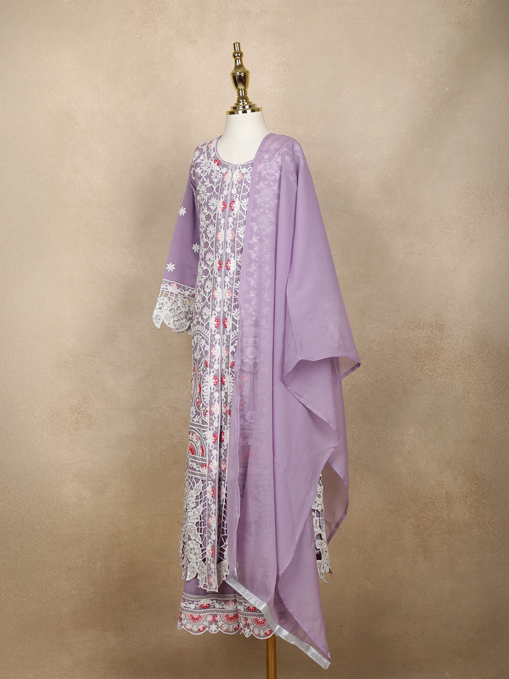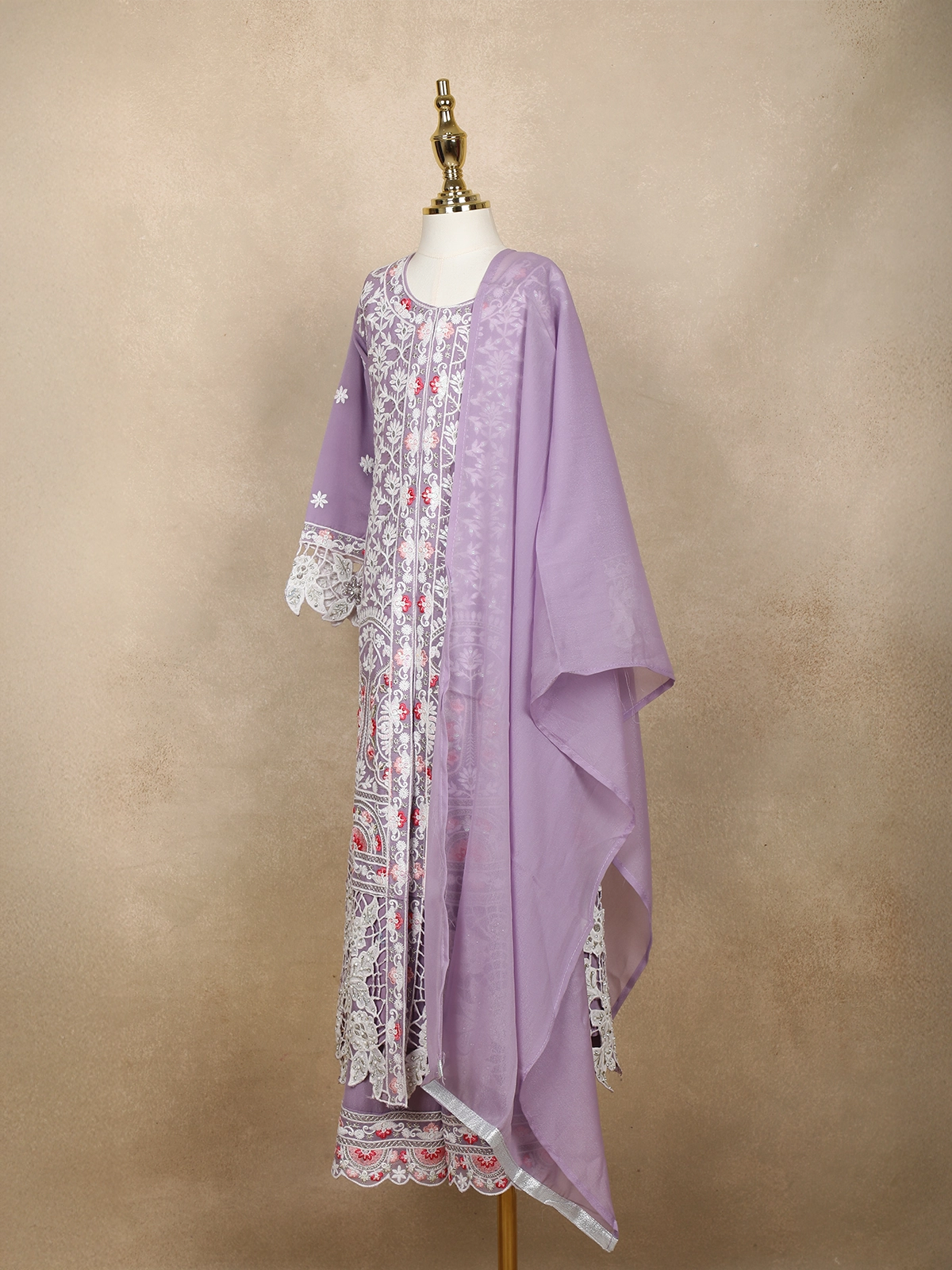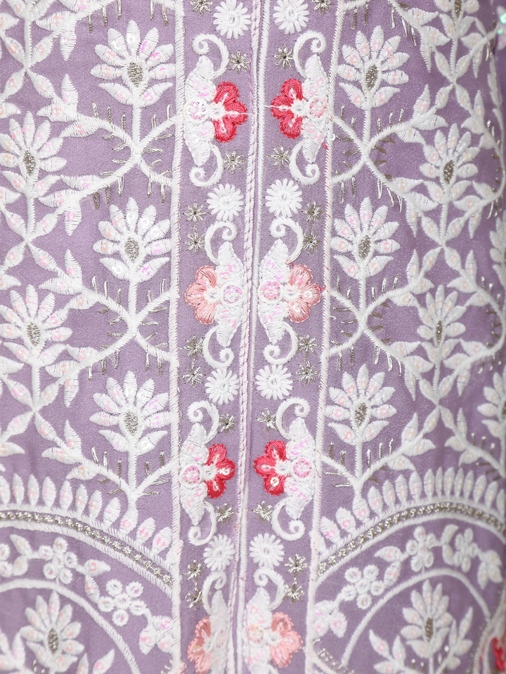 A charming blend of elegance and comfort, this Lavender Kids Georgette Palazzo Suit is beautifully decorated with intricate white floral thread embroidery highlighted with subtle pink and silver sequin detailing. The lovely lace finish at the hem adds a graceful traditional touch.