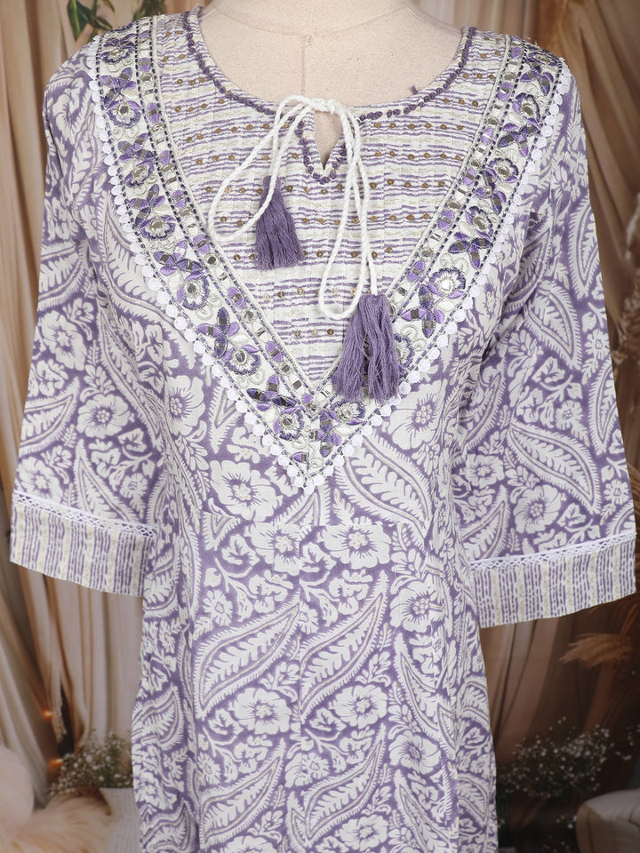 Radiate elegance and freshness with this lavender floral printed cotton salwar suit, crafted to bring charm and comfort together. The soft cotton fabric is adorned with intricate floral prints, beautifully complemented by a mirror and sequin embroidered yoke featuring delicate thread work and lace highlights. The neckline is enhanced with a tassel tie-up for a chic touch, while the matching printed dupatta adds a graceful finish. Ideal for festive mornings, casual get-togethers, or ethnic office wear, this ensemble blends sophistication with simplicity.