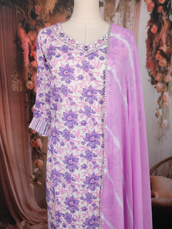 The set is paired with a matching printed cotton pant that complements the floral motifs perfectly, and a light tie-dye patterned chiffon dupatta in soothing lavender with a scalloped border that completes the ensemble gracefully.