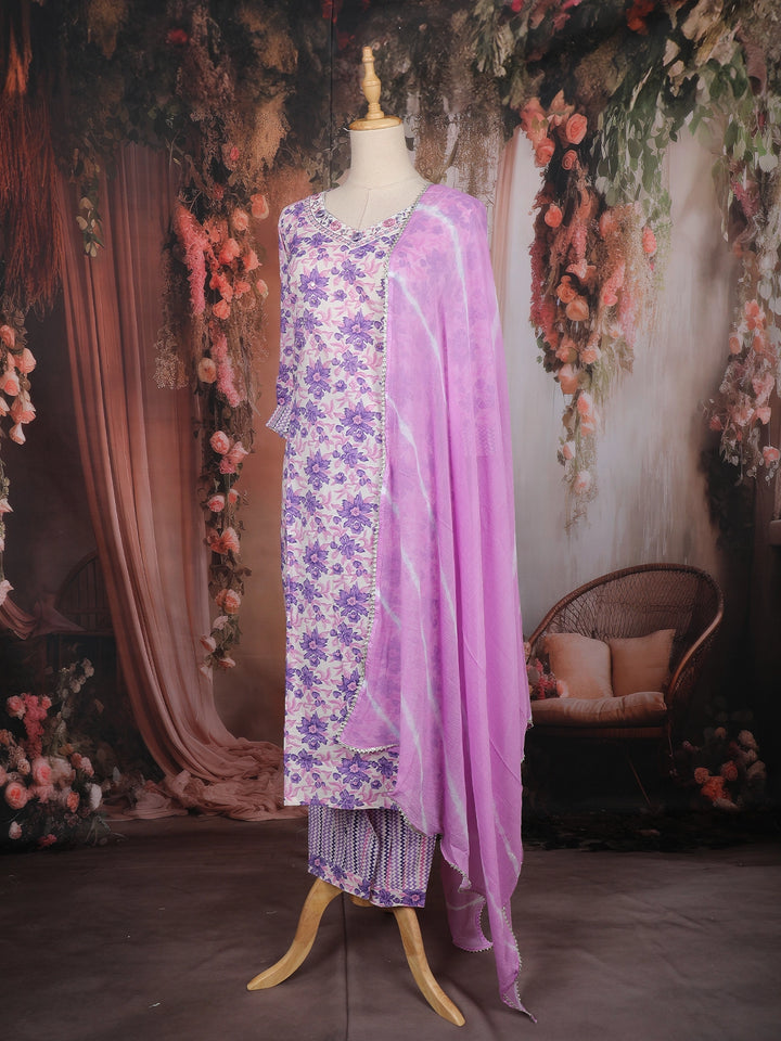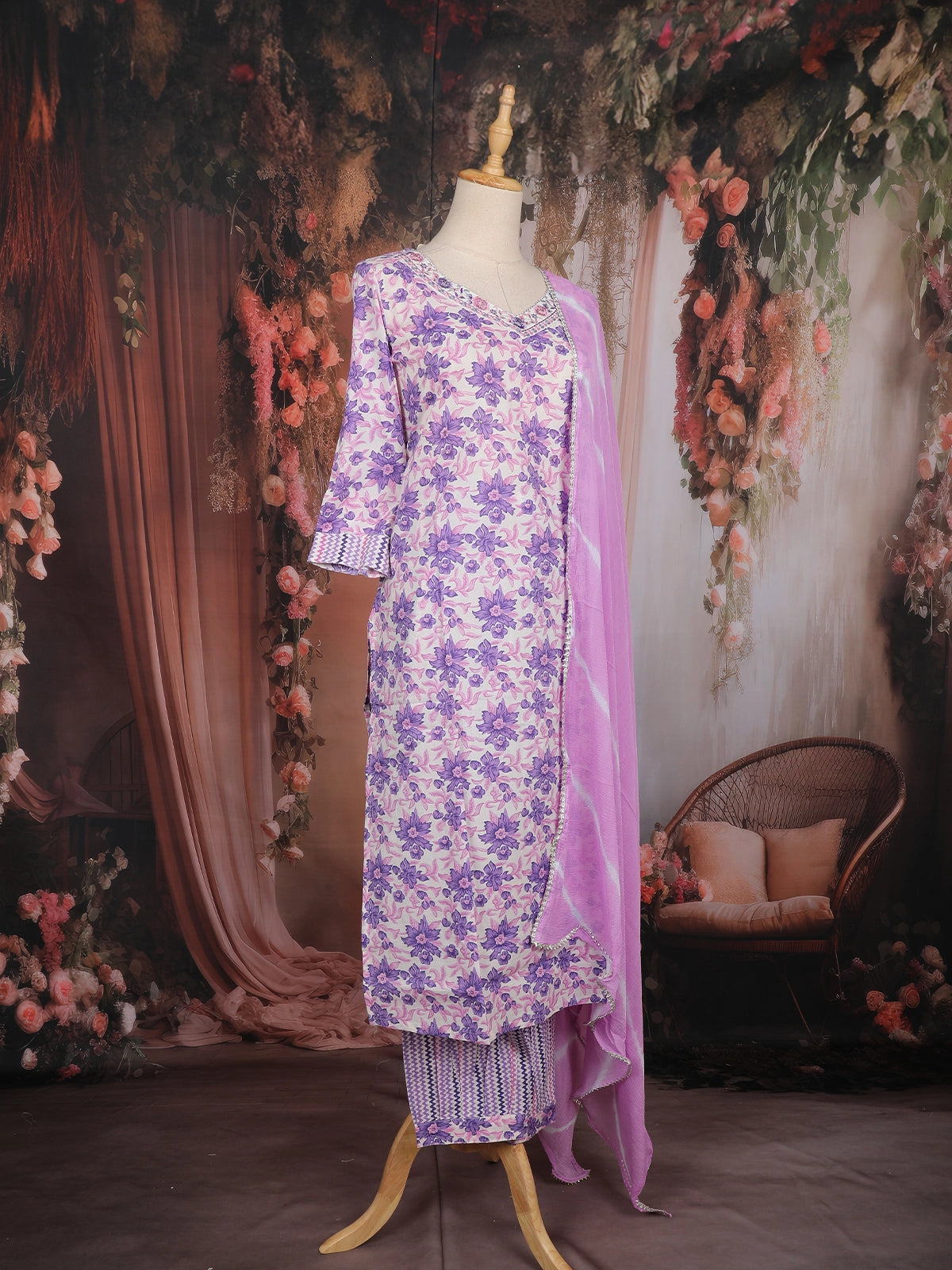 Lavender Floral Printed Cotton Salwar Suit with Dupatta