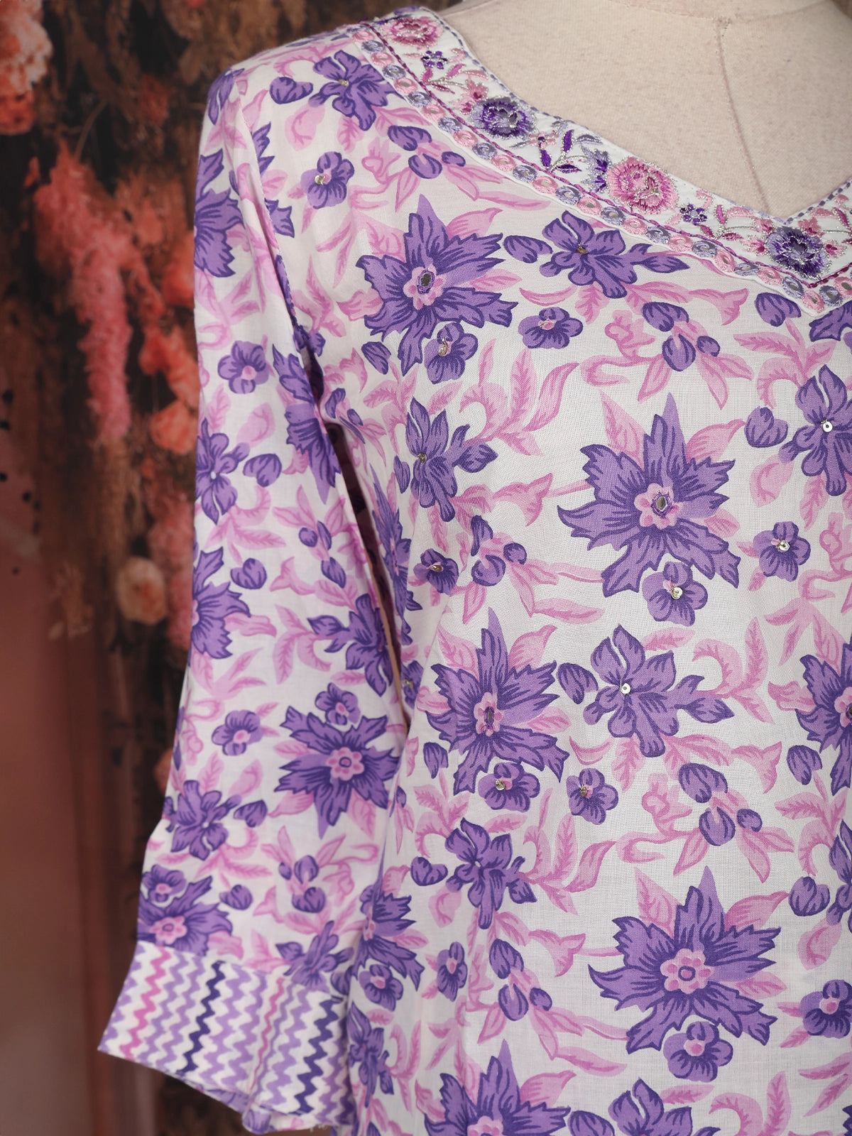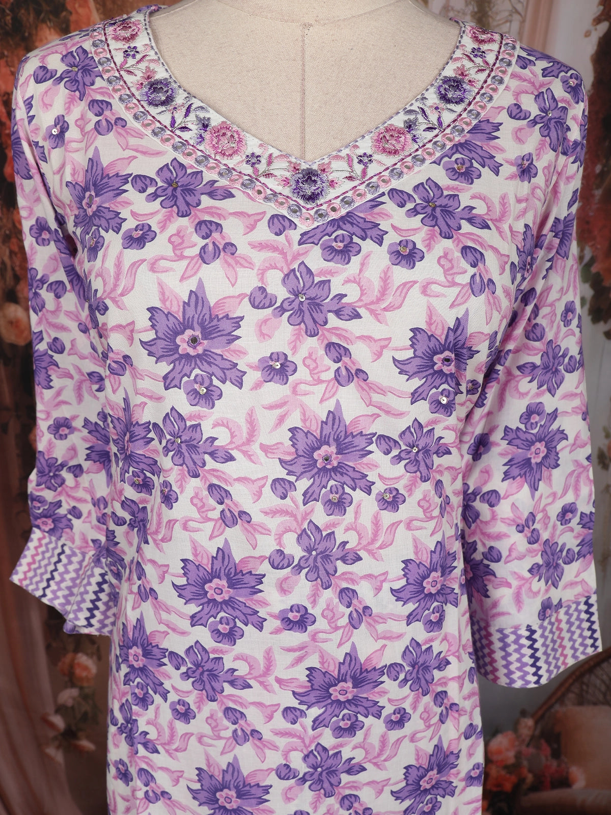 Embrace soft elegance with this Lavender and White Cotton Salwar Suit, adorned with a delicate floral print in shades of purple and pink. The straight-cut kurta features an intricately embroidered V-neckline embellished with tiny sequins, adding a subtle shimmer to the outfit. The sleeves are designed with contrast chevron-patterned cuffs that lend a contemporary twist to the floral charm.