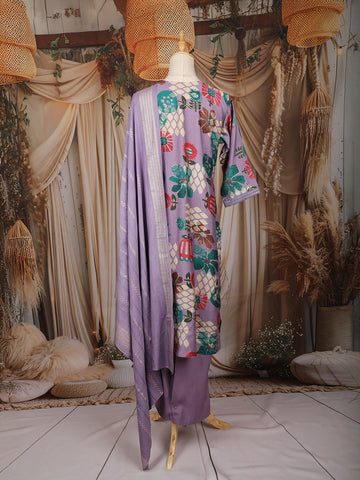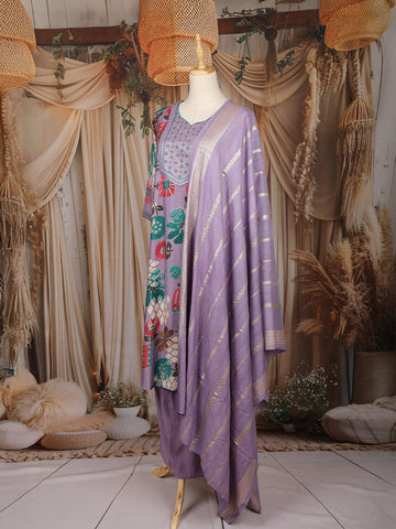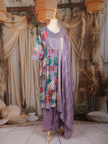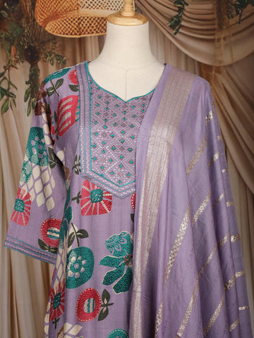 Lavender Floral Printed Cotton Salwar Suit with Embroidered Yoke and Dupatta