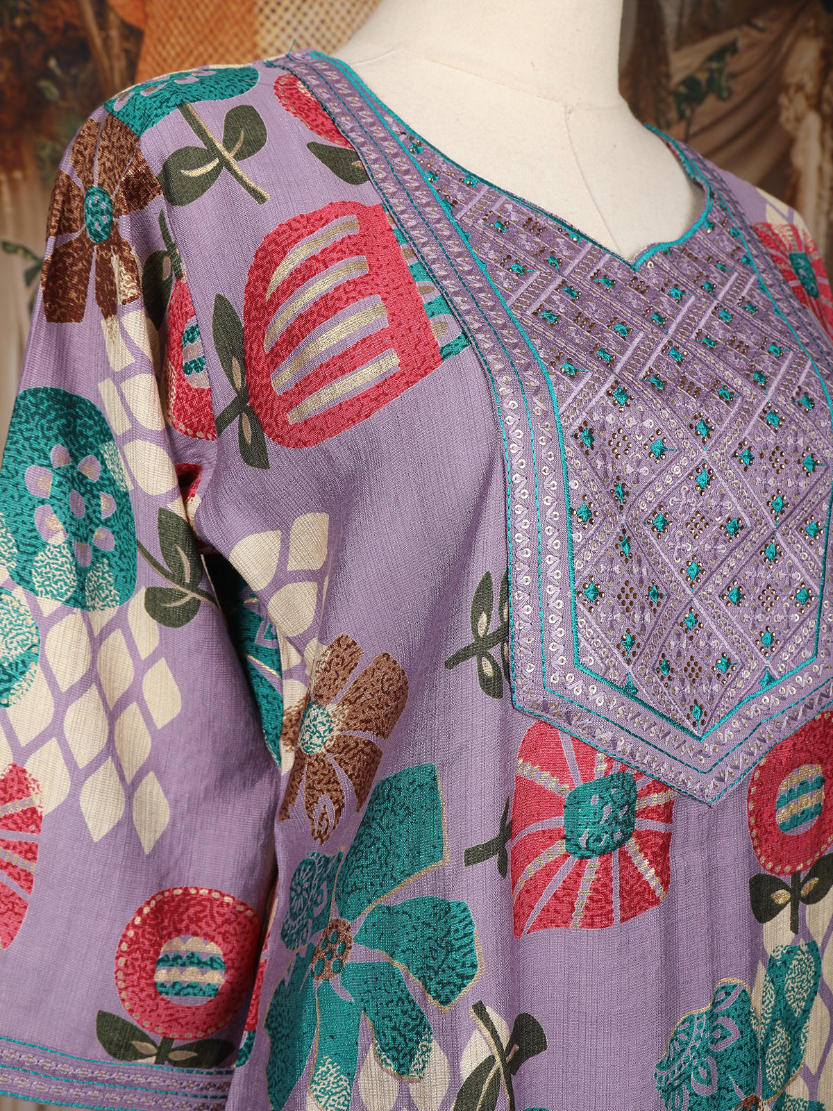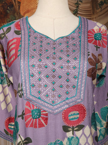 Step into effortless elegance with this Lavender Floral Printed Cotton Salwar Suit, featuring a beautifully embroidered yoke adorned with thread work in geometric motifs. The ensemble showcases a vibrant mix of floral prints in shades of teal, red, and ivory that stand out against the soothing lavender base.