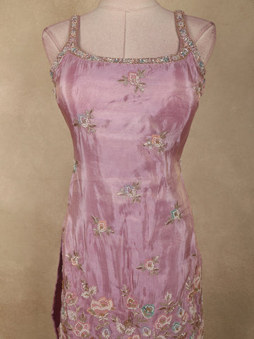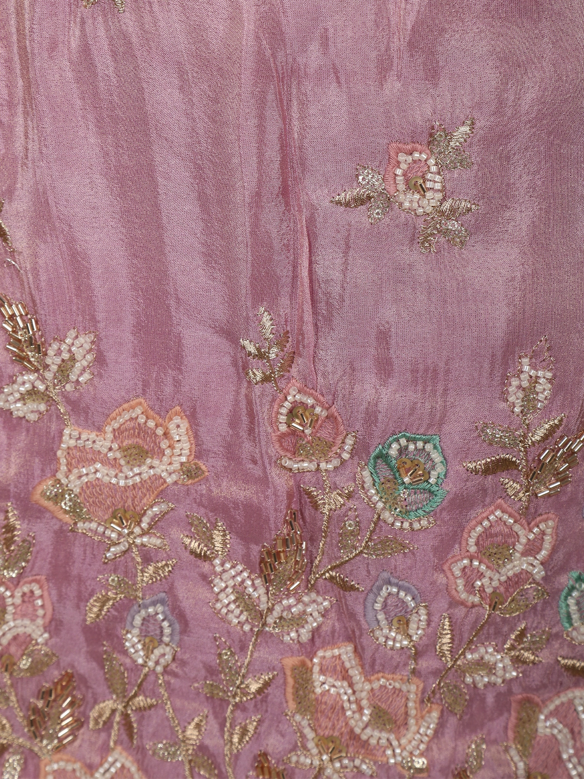 The kurti is crafted in luxurious tissue fabric, adorned with delicate floral motifs embroidered using sequins and fine beadwork. These embellishments are thoughtfully scattered across the body, while the hemline features slightly denser floral embroidery for a balanced, graceful finish. The neckline and shoulder straps are highlighted with subtle stone and bead detailing, adding a touch of shimmer without overpowering the softness of the design.