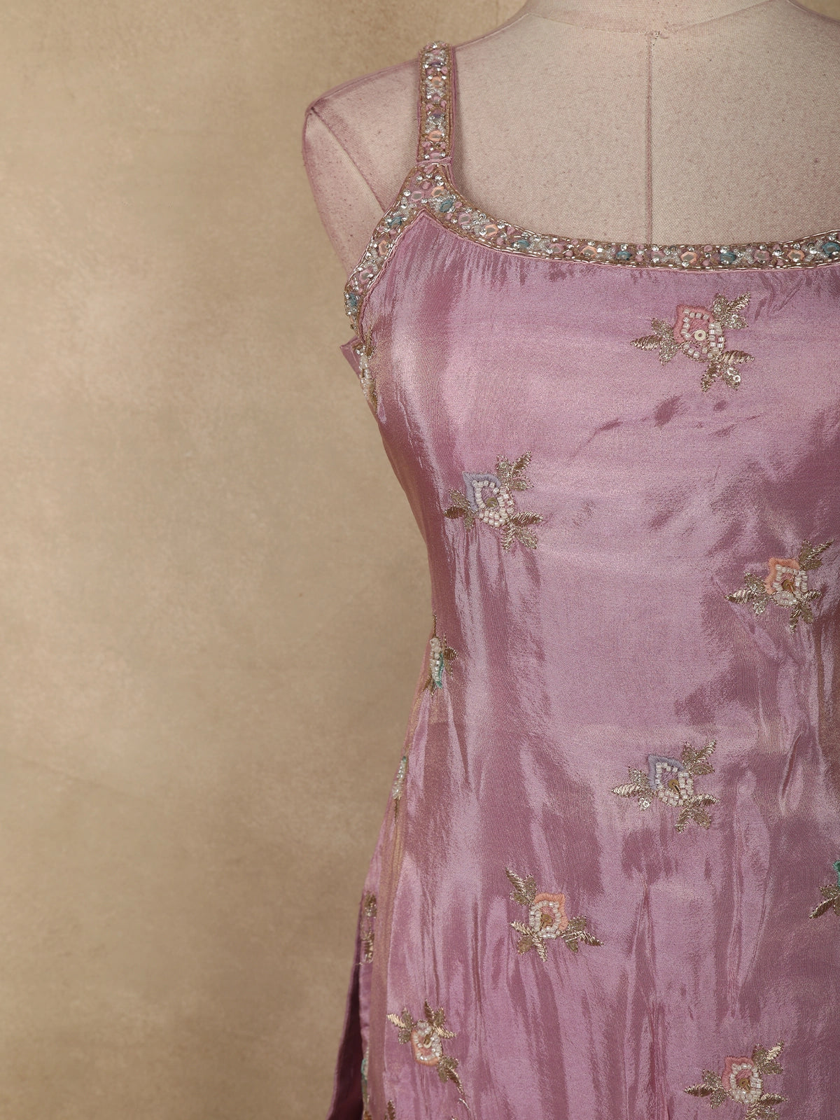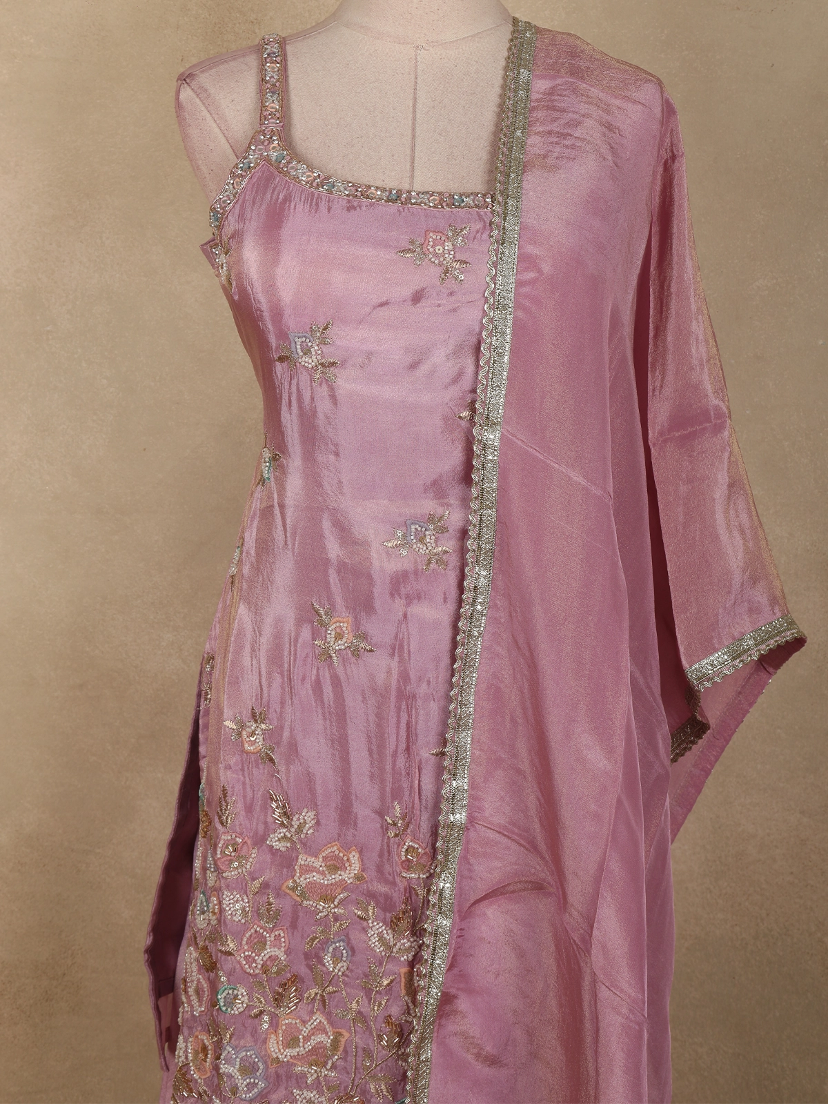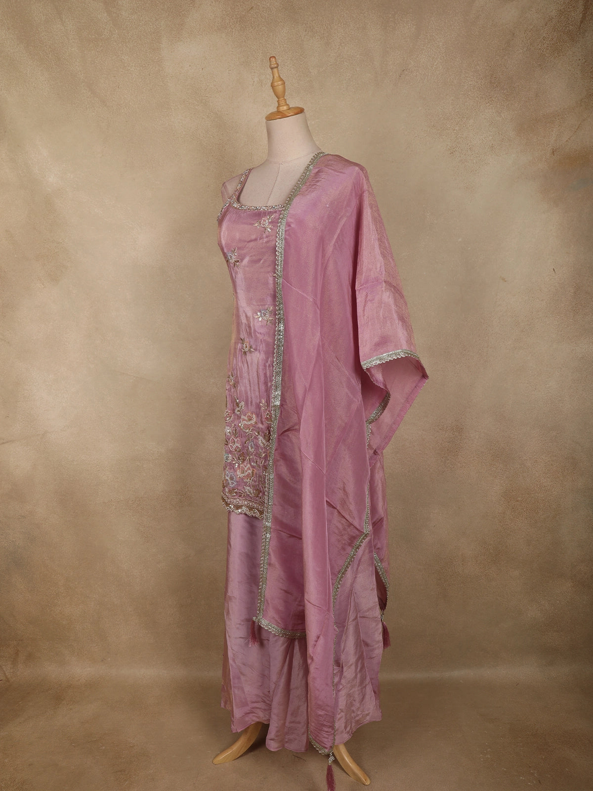 Lavender Floral Sequins and Beads Embroidered Design Tissue Palazzo Suit with Dupatta