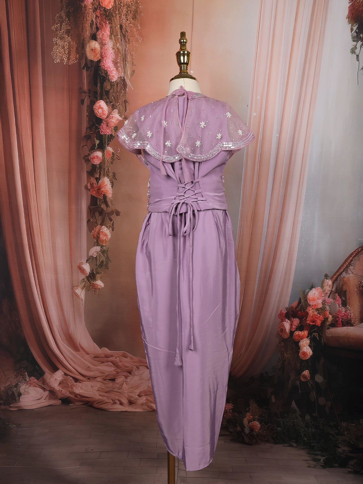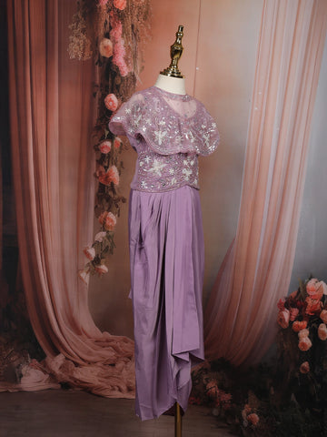 This elegant lavender lehenga set is designed to bring a soft, festive charm to special occasions. The sleeveless blouse features a flattering V-neckline and is beautifully adorned with intricate floral embroidery highlighted by delicate sequins and bead embellishments. Crafted on a sheer net base, the detailed workmanship adds a subtle shimmer and refined elegance to the outfit.