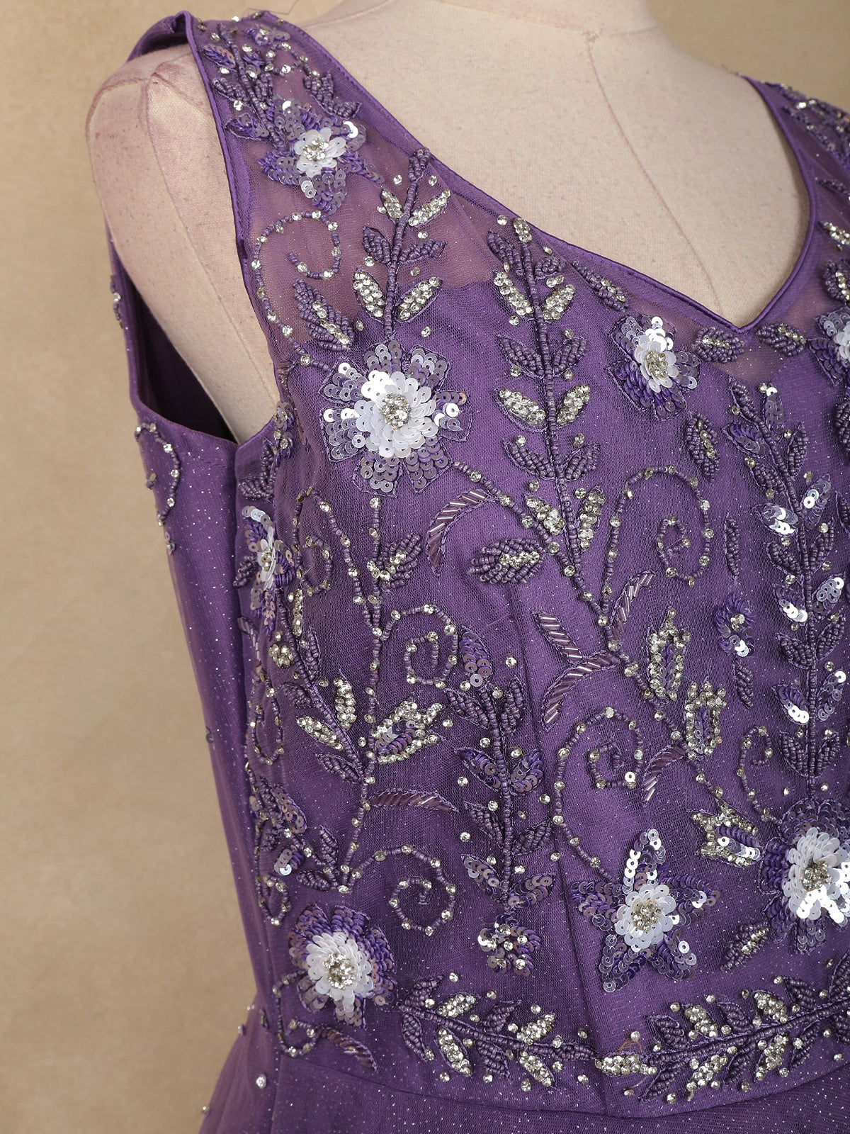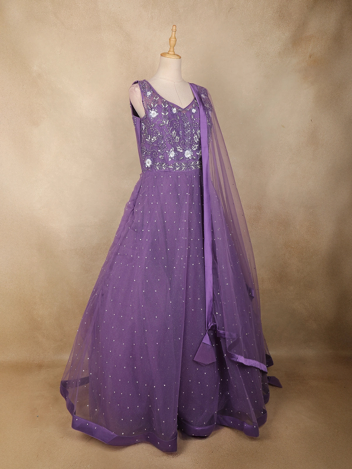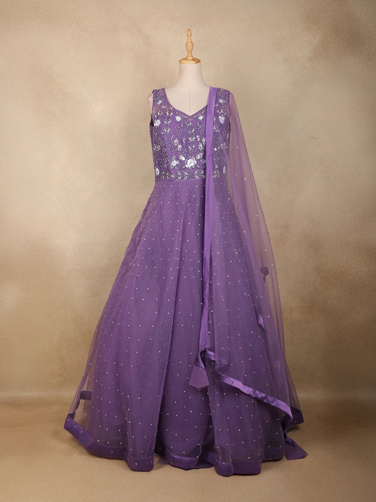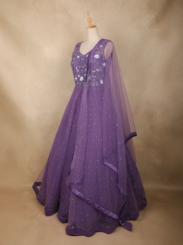 Lavender Floral Sequins Embroidered Lehenga Set with Net Dupatta