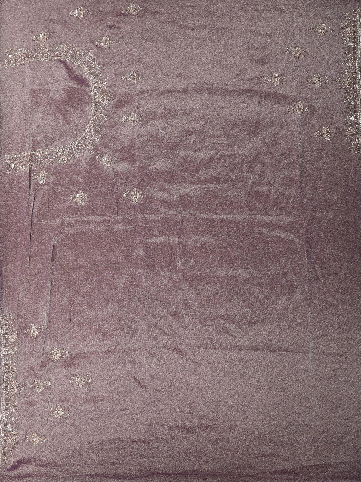 The highlight lies in its detailed designer border, adorned with scalloped edges and exquisite floral sequins embroidery that adds a sparkling touch to the ensemble. Minimal but elegant embroidered motifs are placed thoughtfully across the body, ensuring a refined balance of sophistication and glamour.