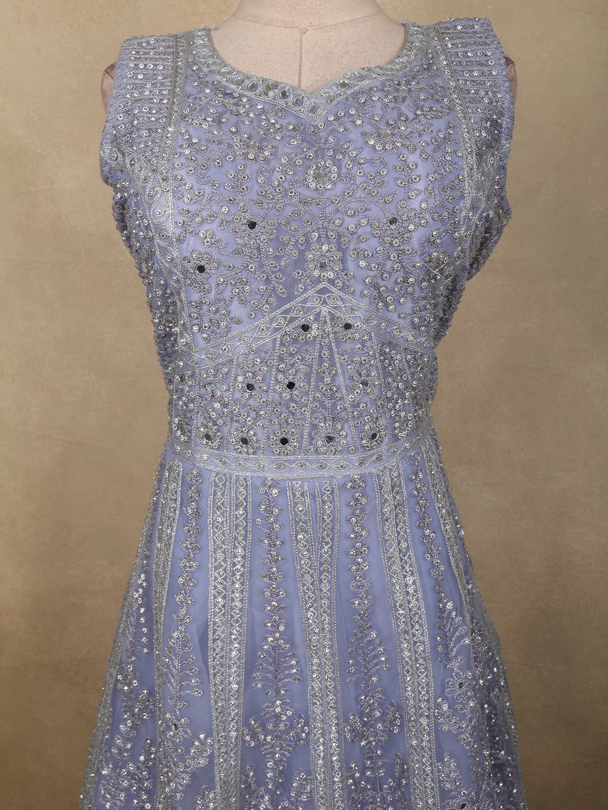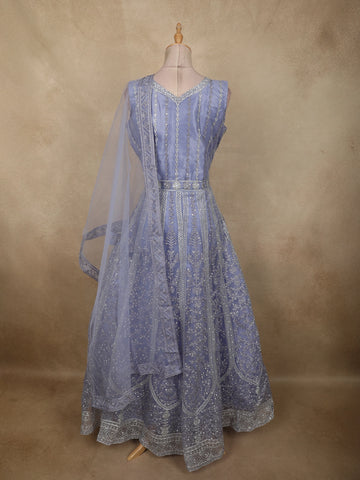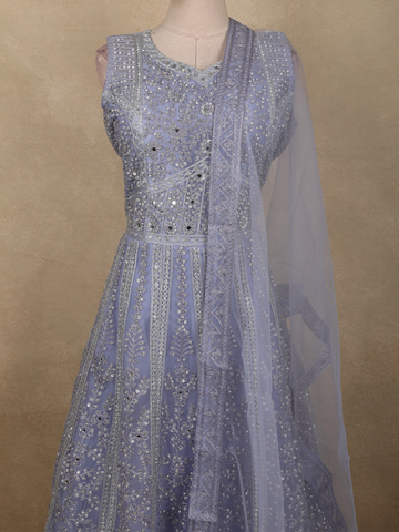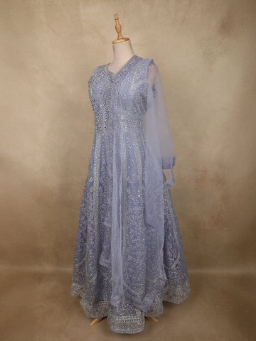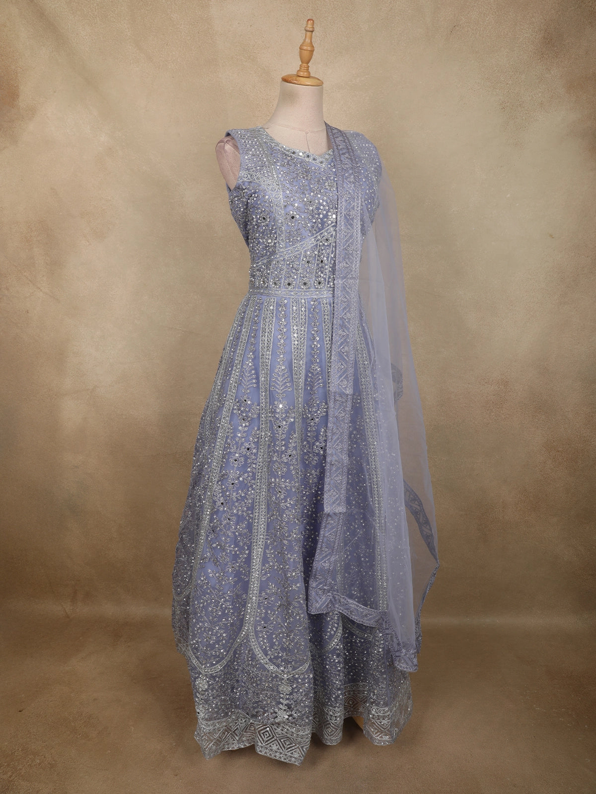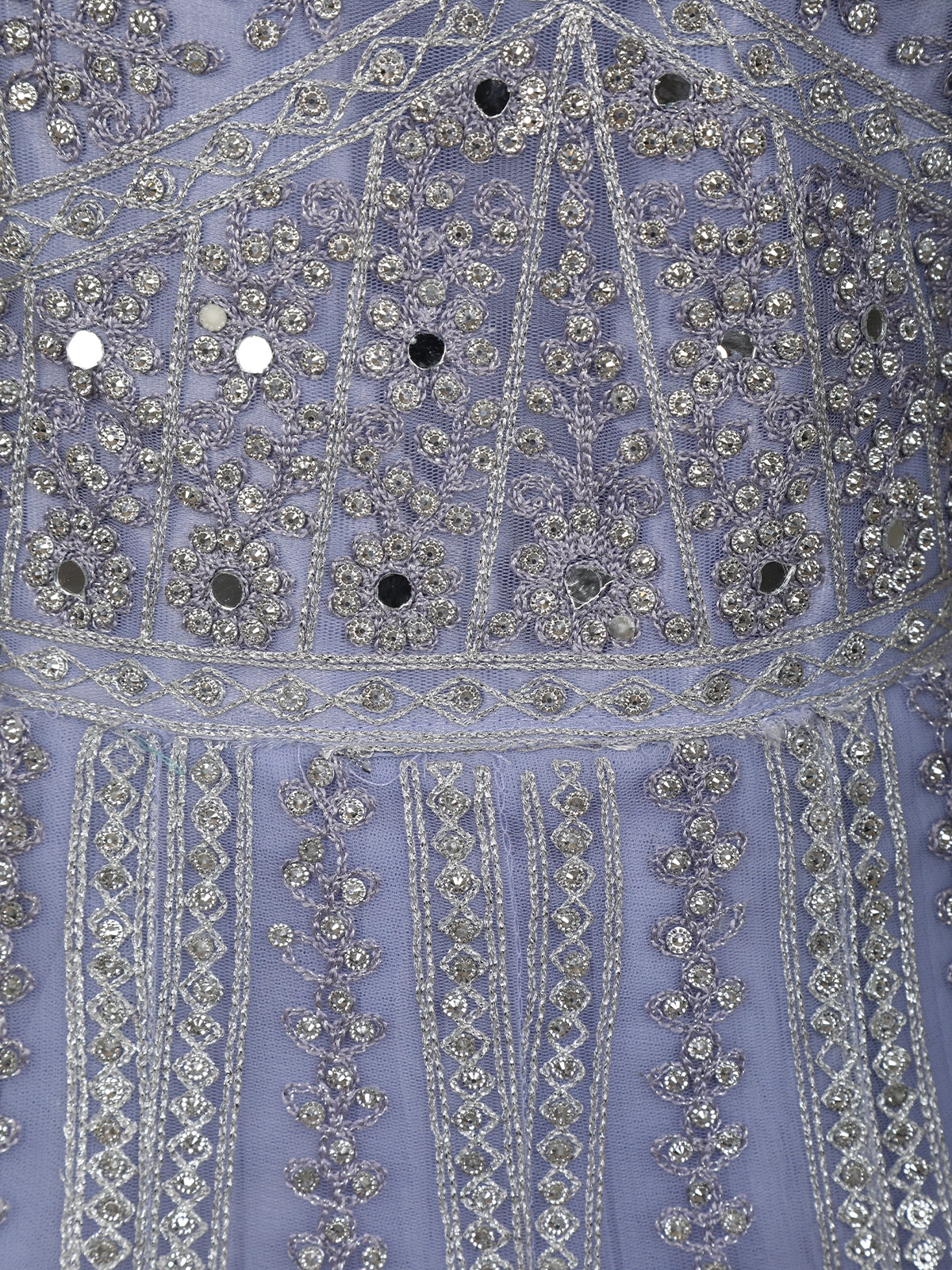 Lavender Floral Thread and Mirror Embroidered Design Net Gown with Dupatta