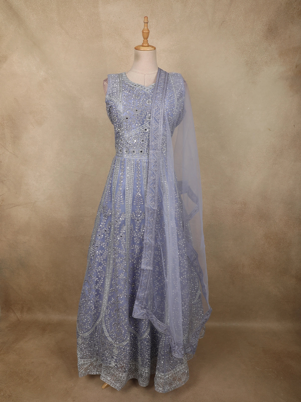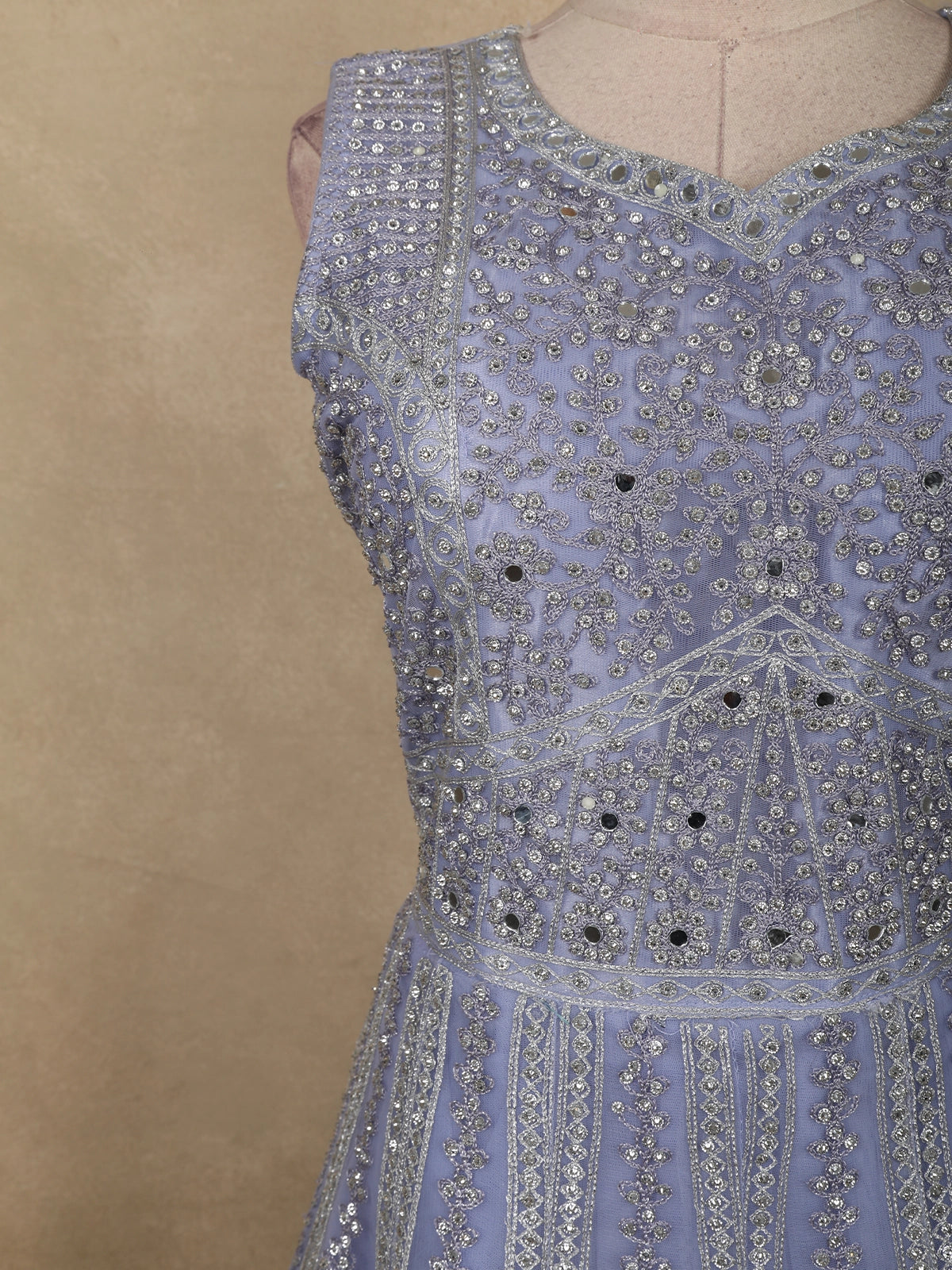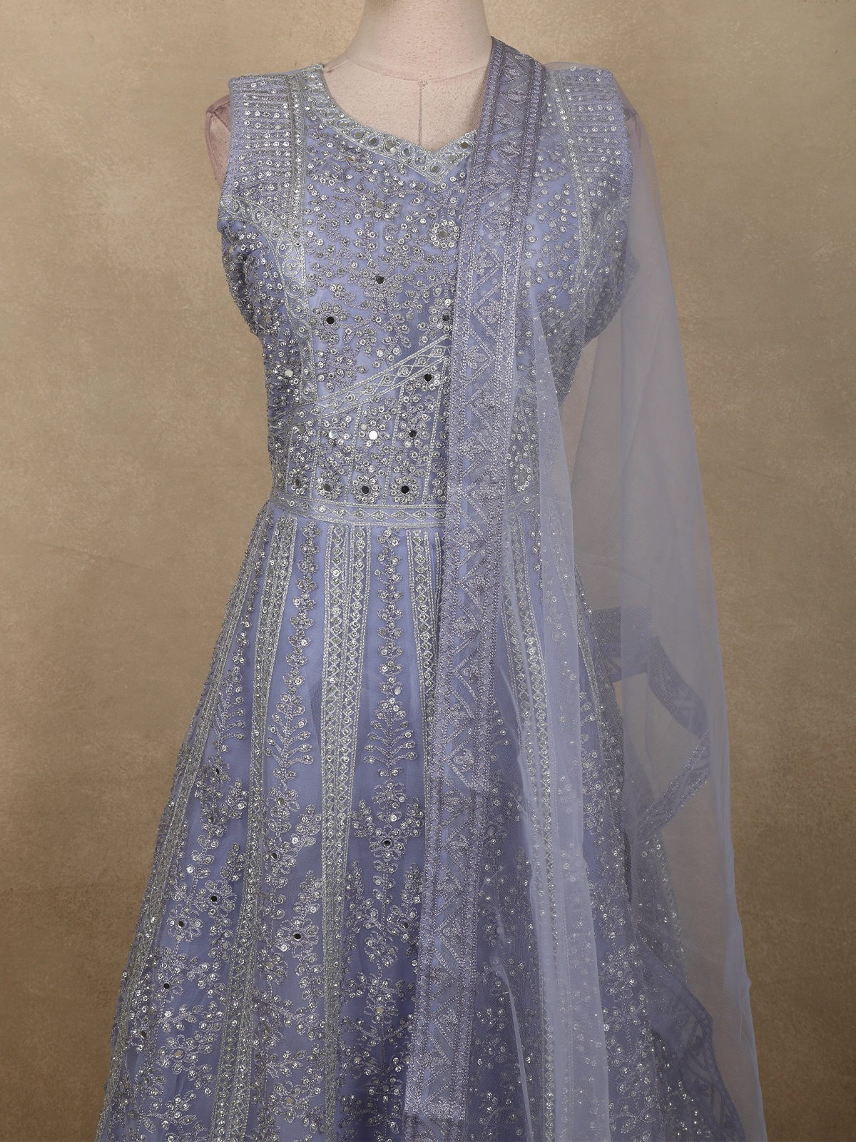 Lavender Floral Thread and Mirror Embroidered Design Net Gown with Dupatta