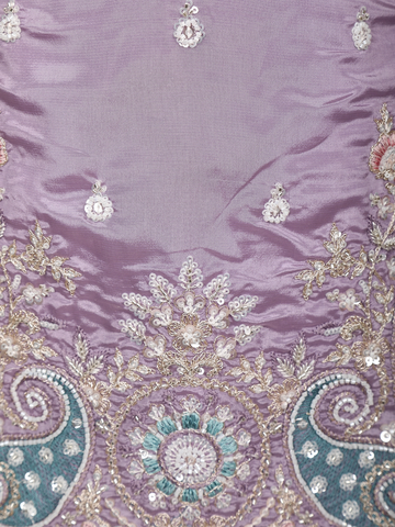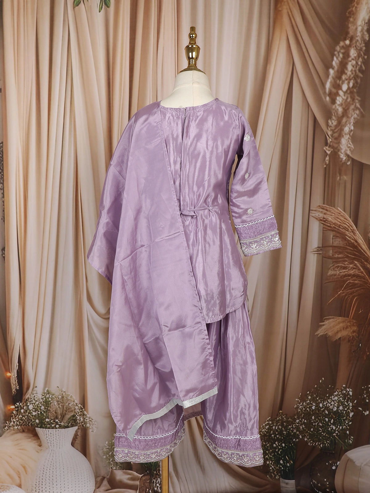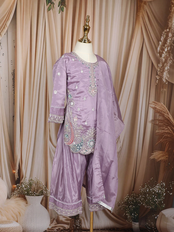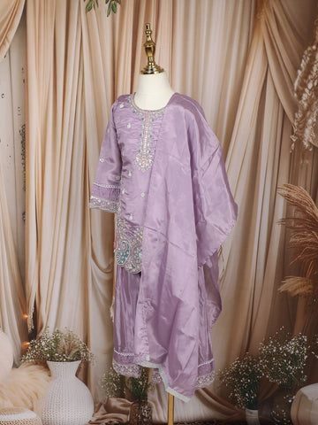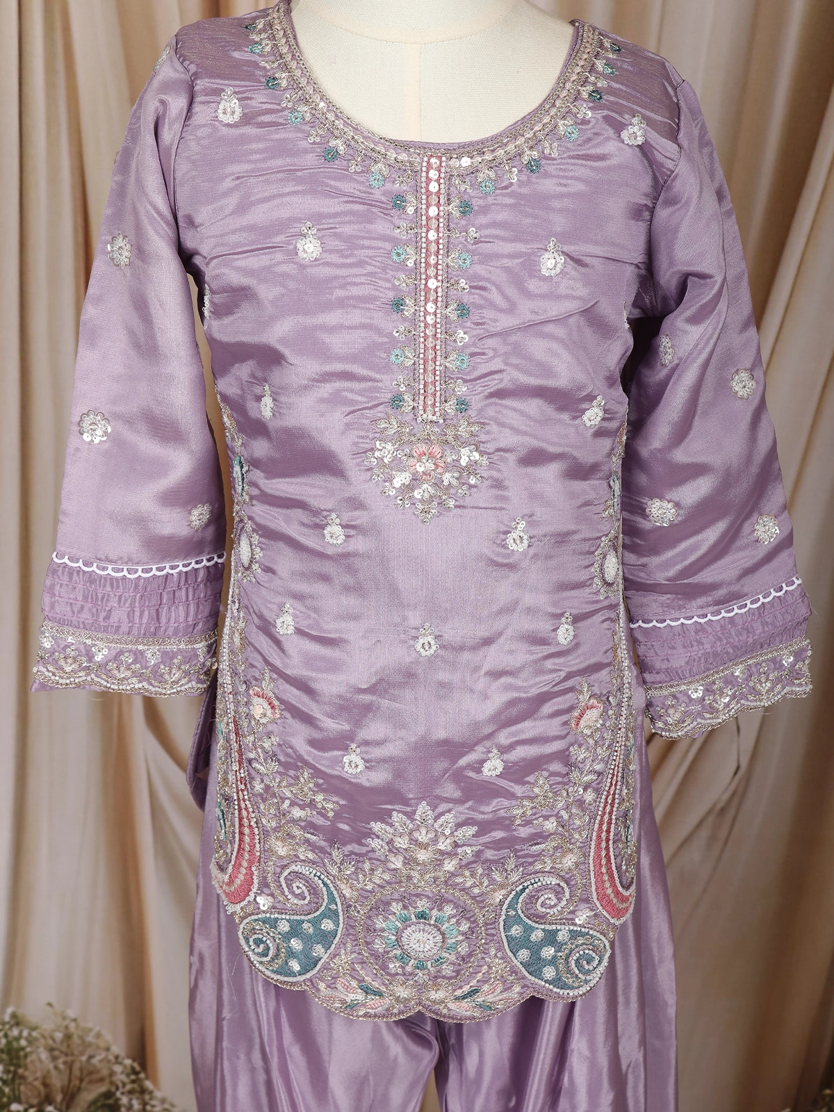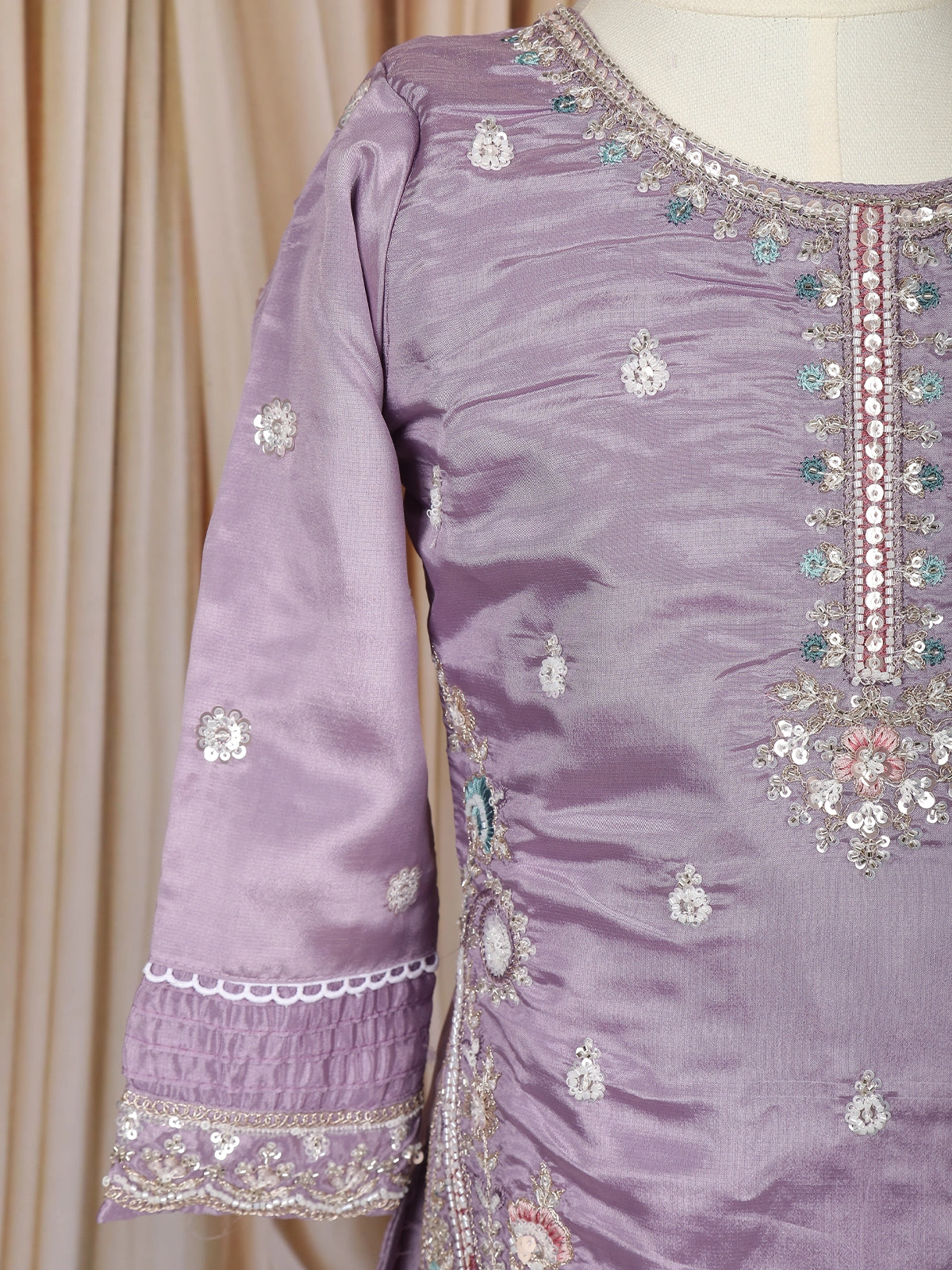 Lavender Floral Thread and Sequins Embroidered Design Tissue Silk Kids Palazzo Suit