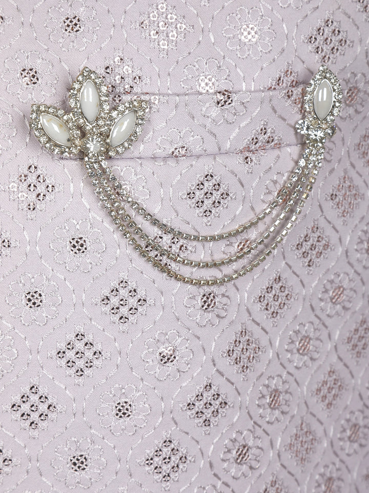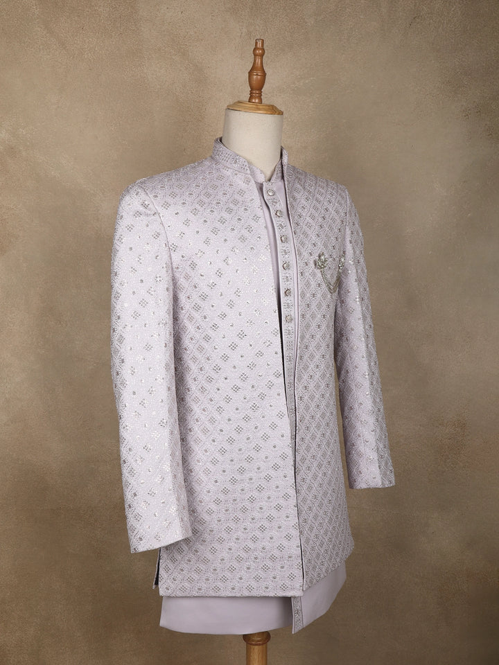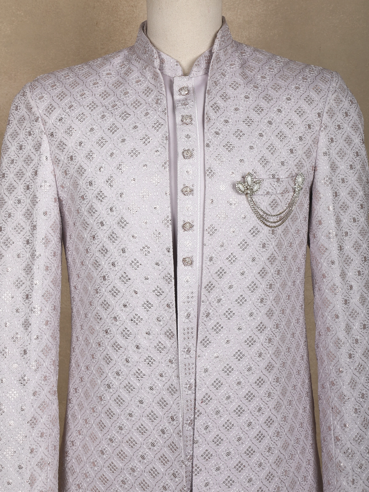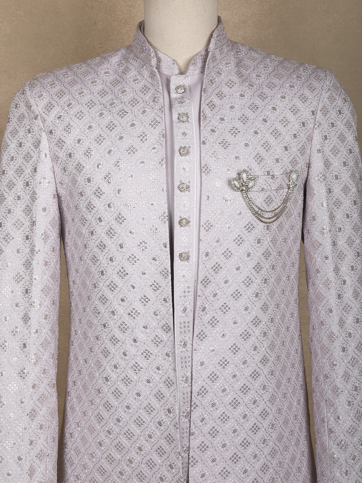 Lavender Floral Woven Design Jacquard Sherwani Suit with Brooch