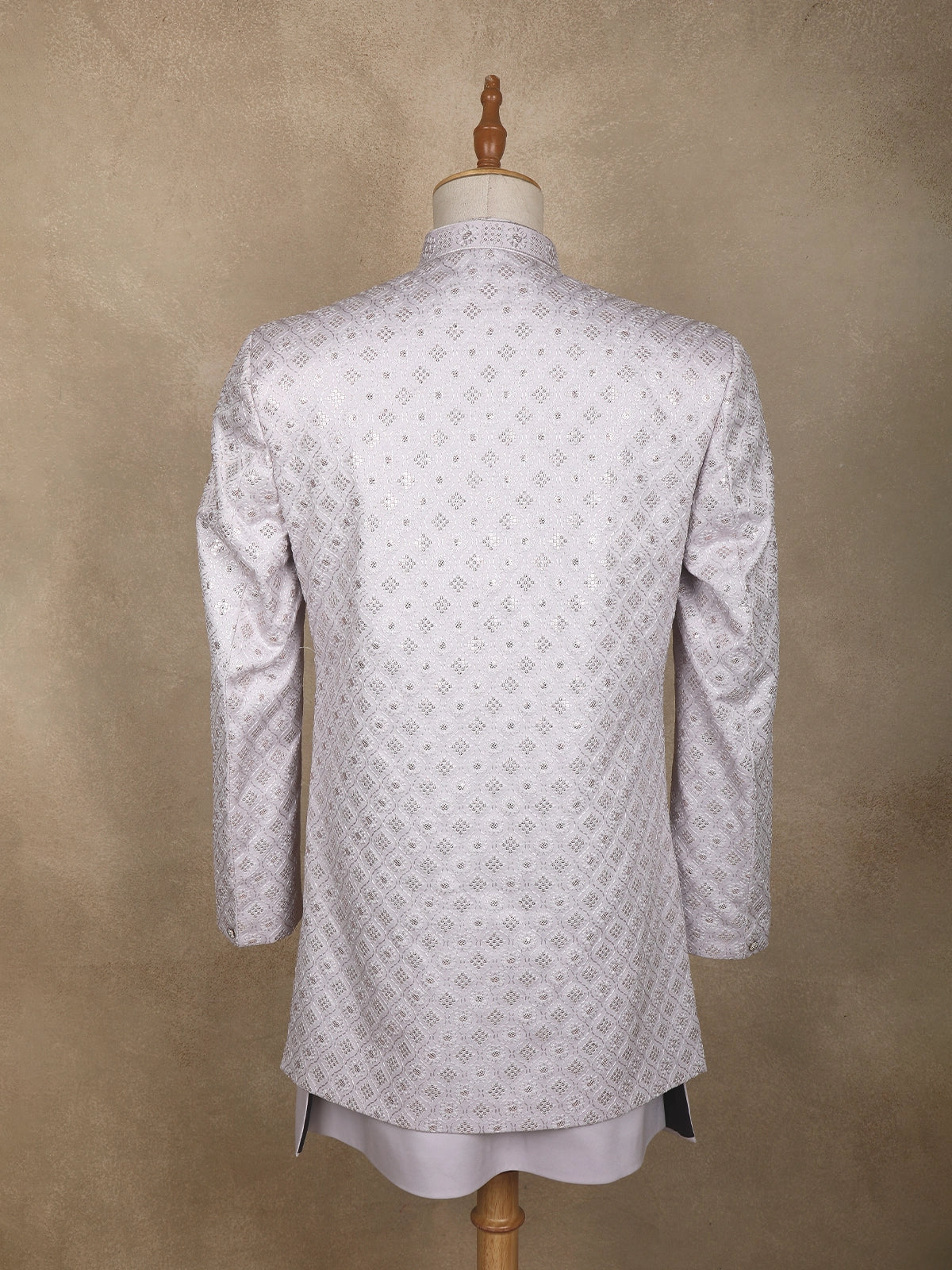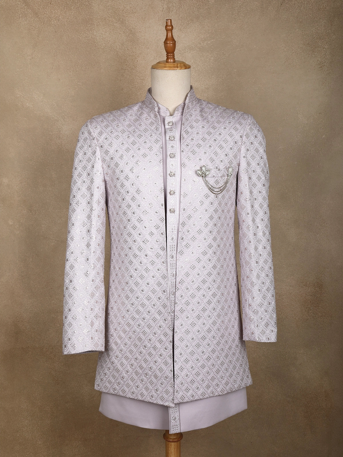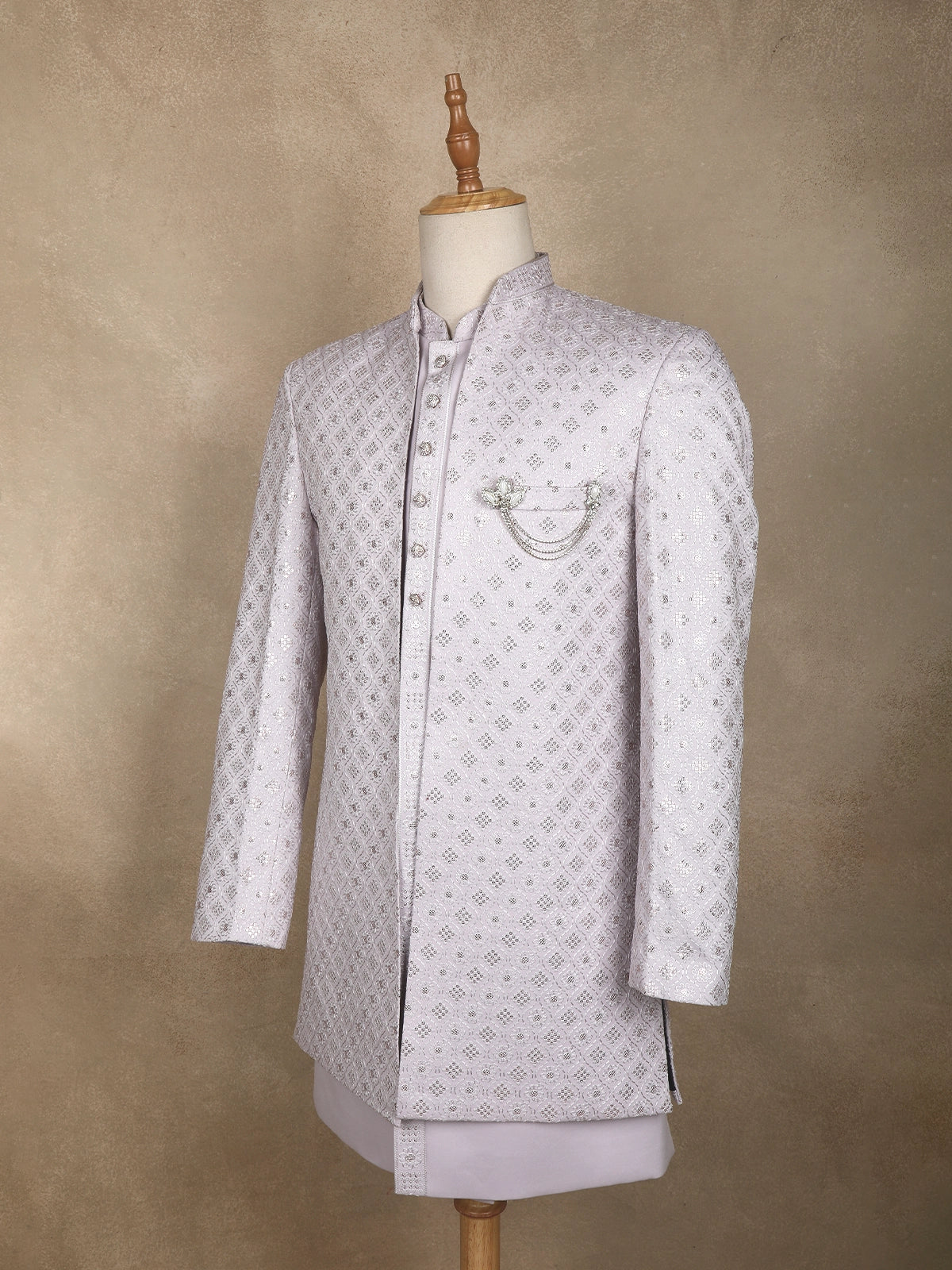 Lavender Floral Woven Design Jacquard Sherwani Suit with Brooch