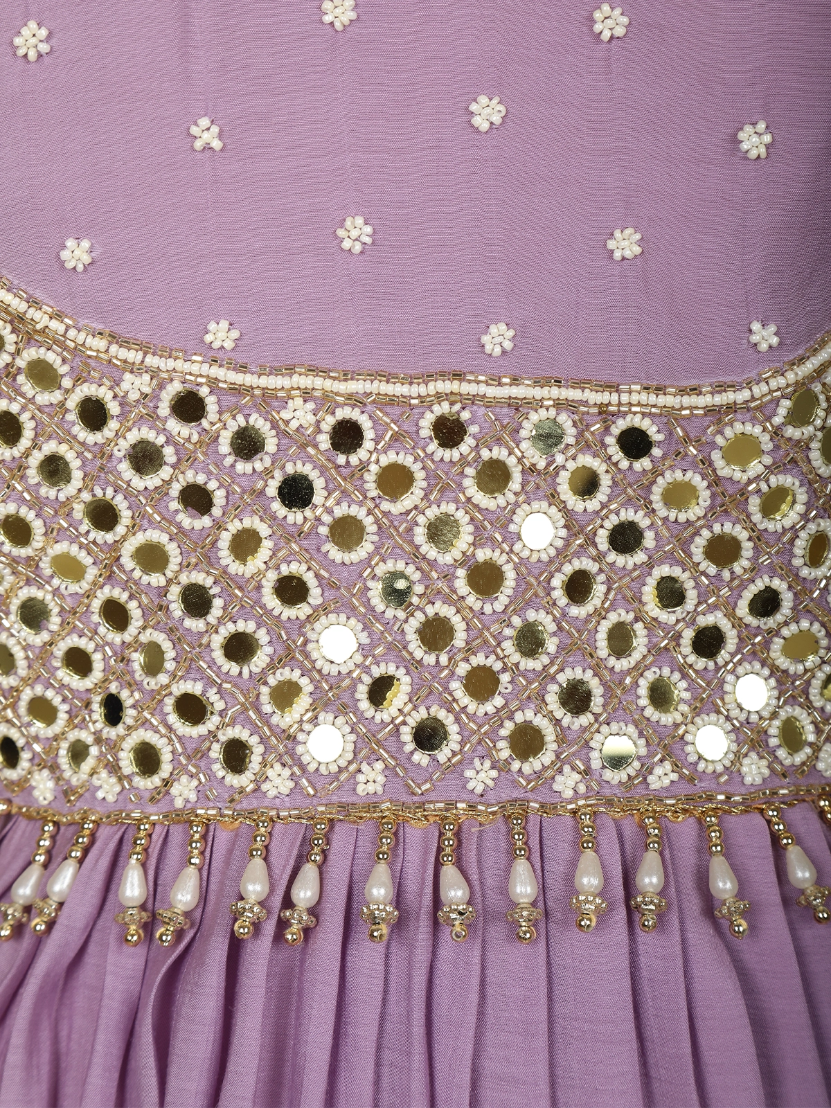 Step into graceful elegance with this stunning Lavender Cotton Salwar Suit. The bodice features delicate hand mirror work adorned with tiny bead and thread detailing, adding the perfect festive sparkle. The soft Cotton fabric drapes effortlessly, enhanced by a gathered waist that offers a flattering and flowy silhouette.