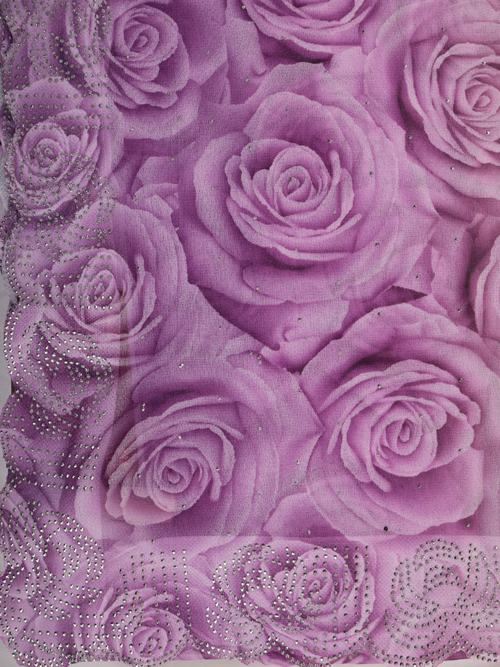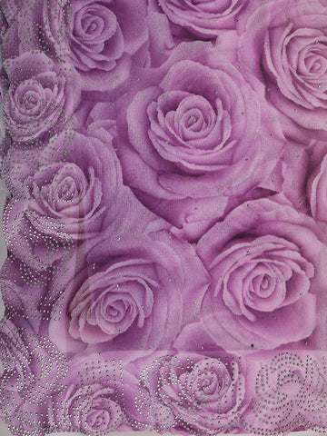Lavender Rose Floral Printed Chiffon Saree with Stone Embellished Scallop Border