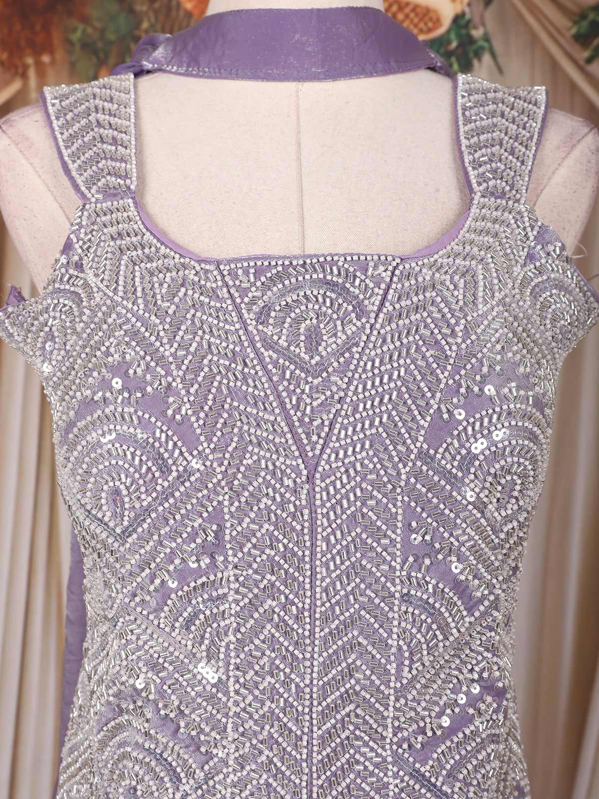 The soft lavender hue lends a romantic allure, while the square neckline and straight-cut silhouette add a touch of contemporary finesse. The flowing palazzo pants, made from matching organza-blend fabric, enhance comfort and movement, creating a graceful drape that’s perfect for festive celebrations or evening soirées. Completing the look is a choker-style dupatta, designed to sit elegantly around the neck, offering a bold, fashion-forward finish to this delicate creation.