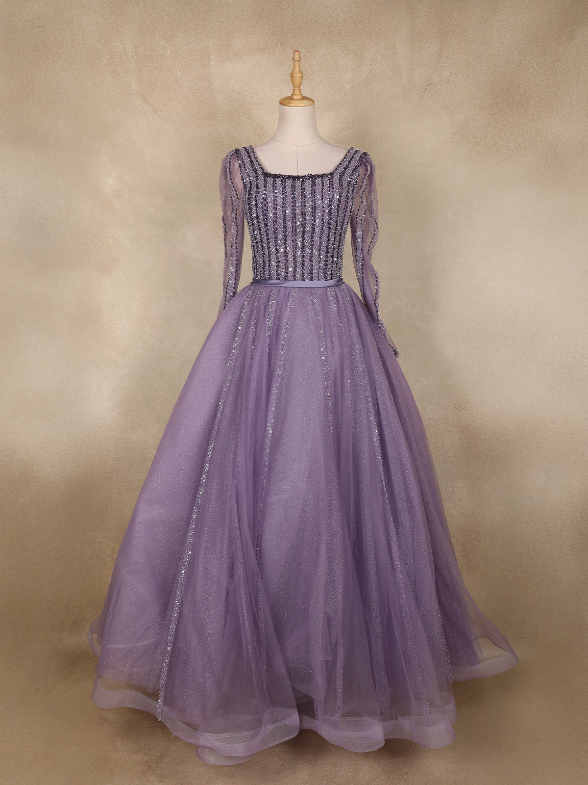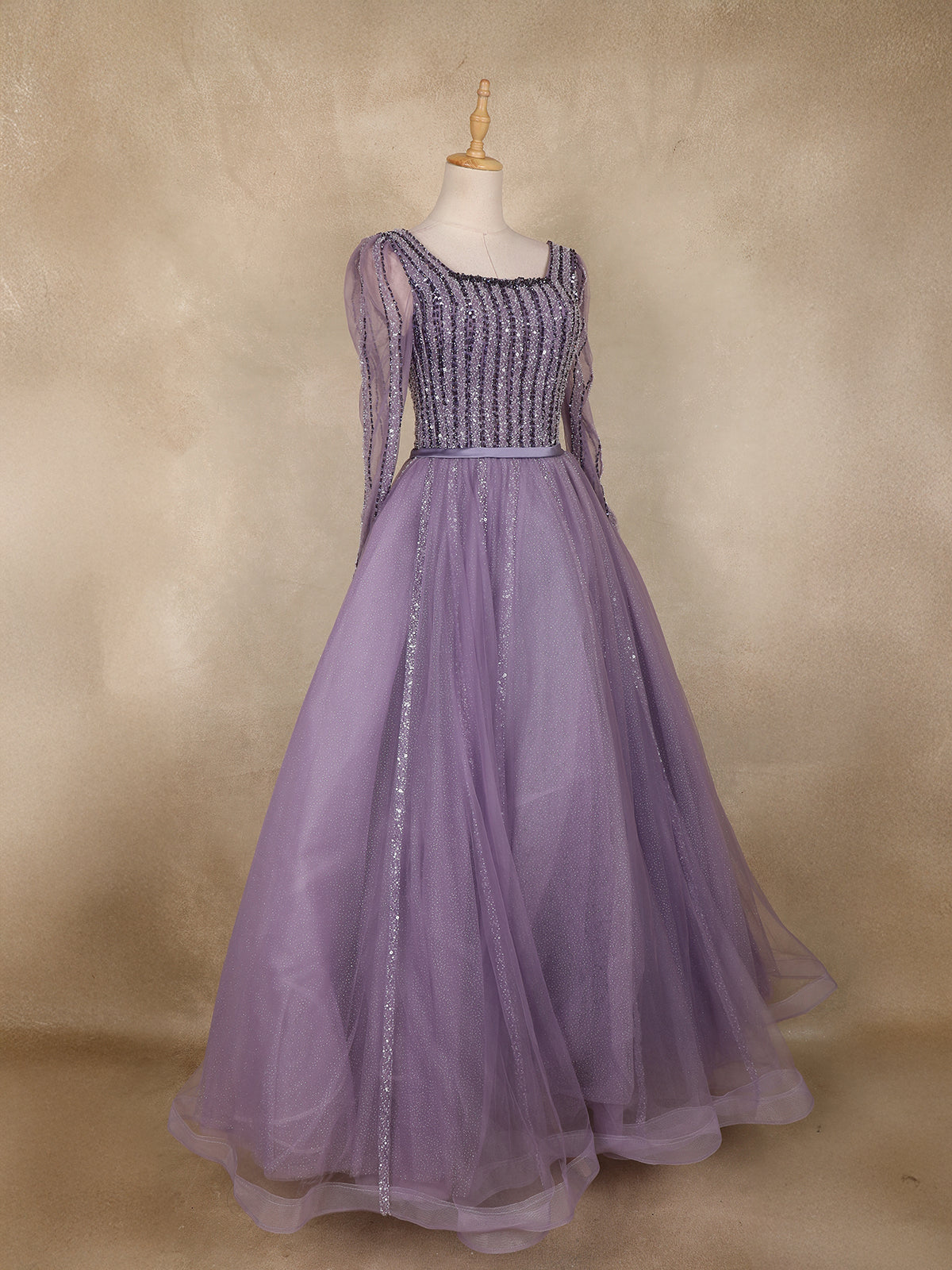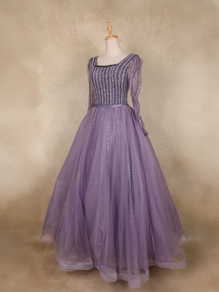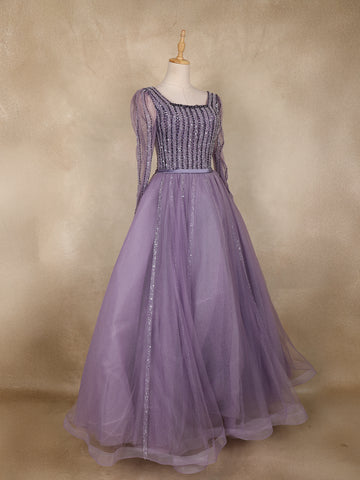 Lavender Sequins Embellished Design Net Ball Gown with Full Sleeves