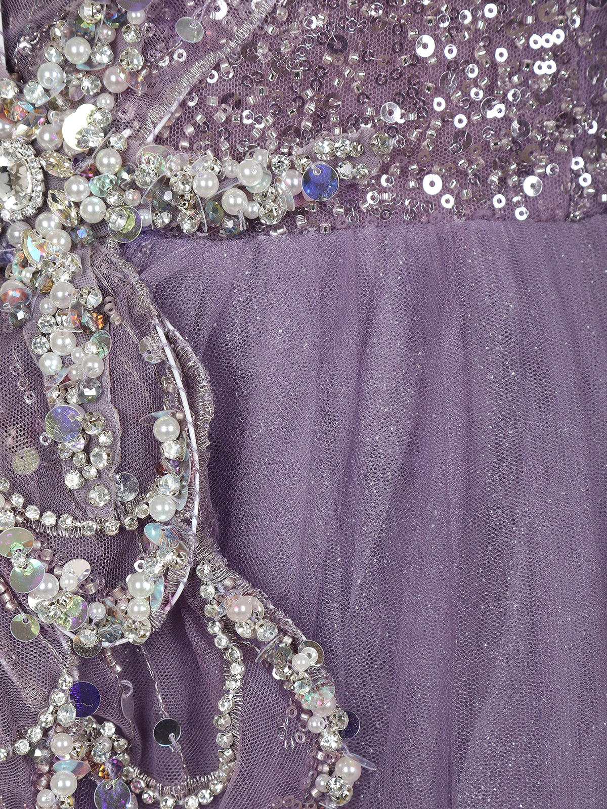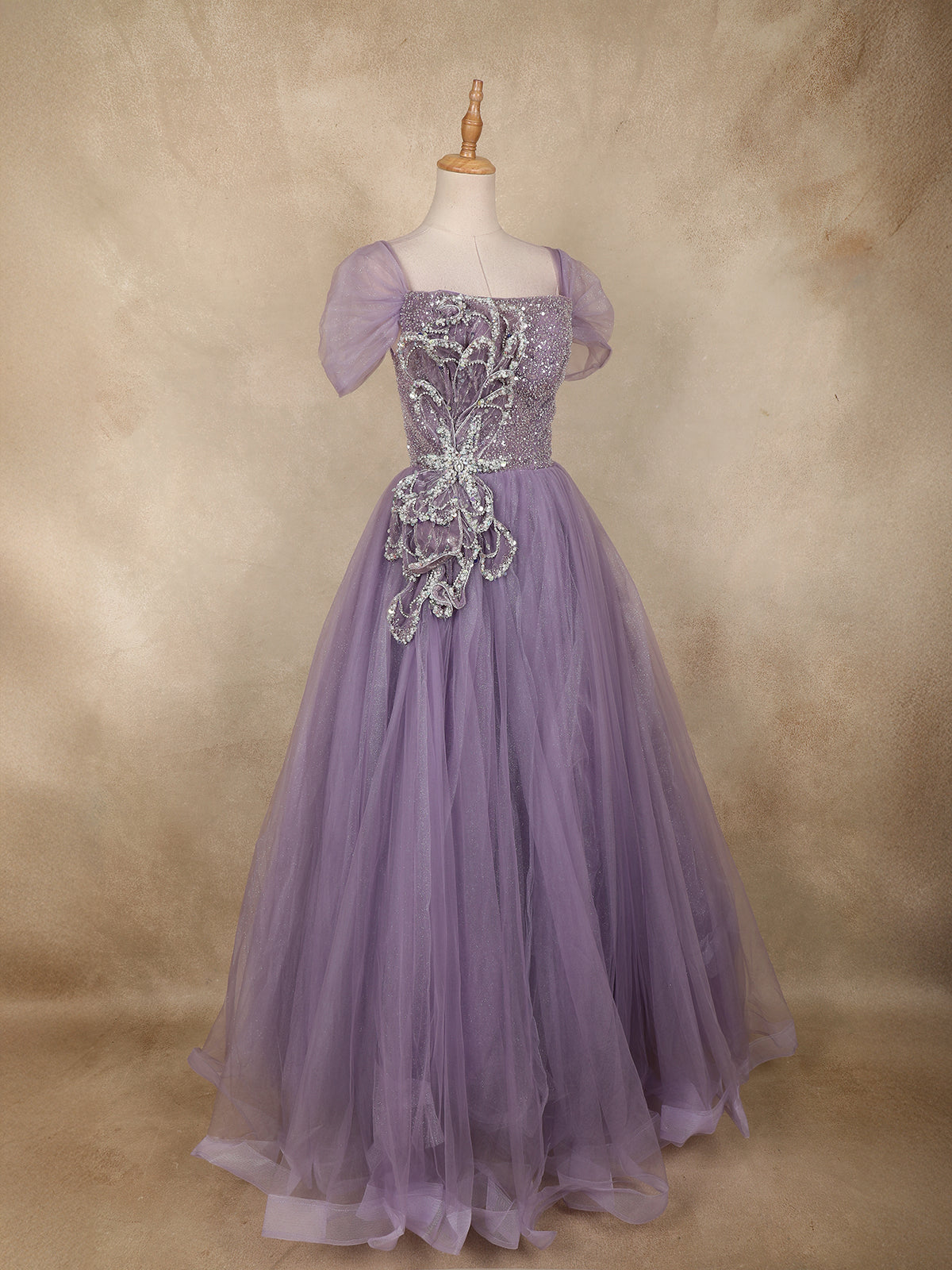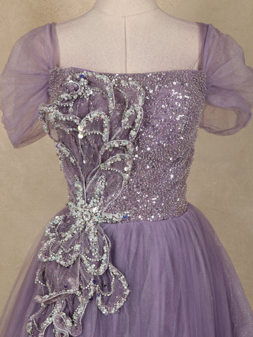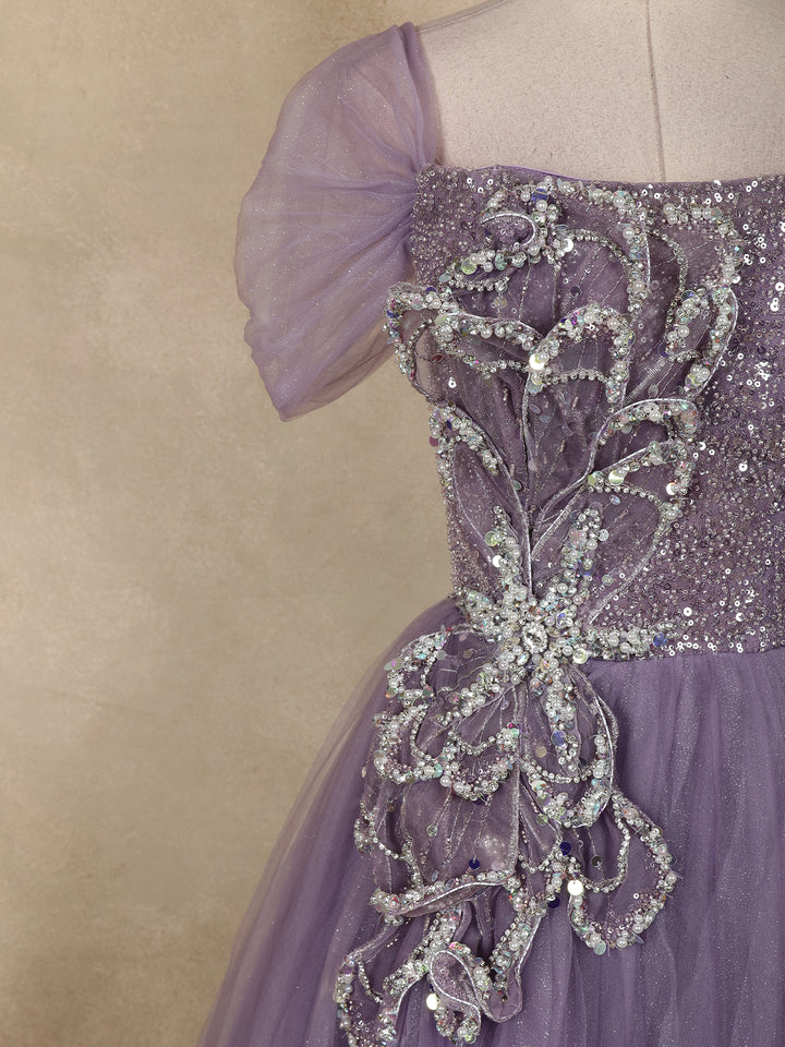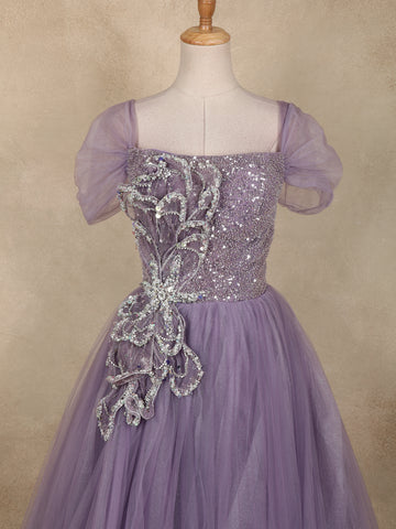 Lavender Sequins Embellished Design Net Ball Gown with Puff Sleeves