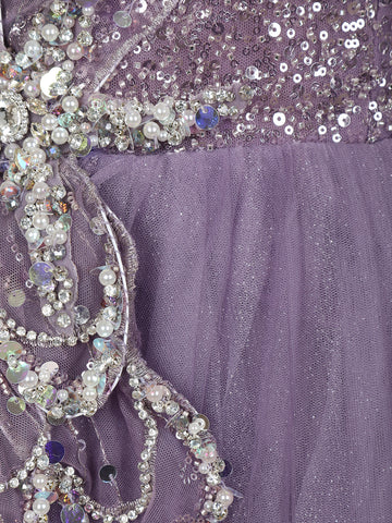 Feel like a fairy-tale enchantress in this dreamy Lavender Sequins Embellished Net Ball Gown, designed to bring a graceful radiance to your celebrations. The fitted bodice glimmers with intricate sequin detailing, while the statement floral appliqué cascades artfully along the waistline, adding a lavish couture touch.