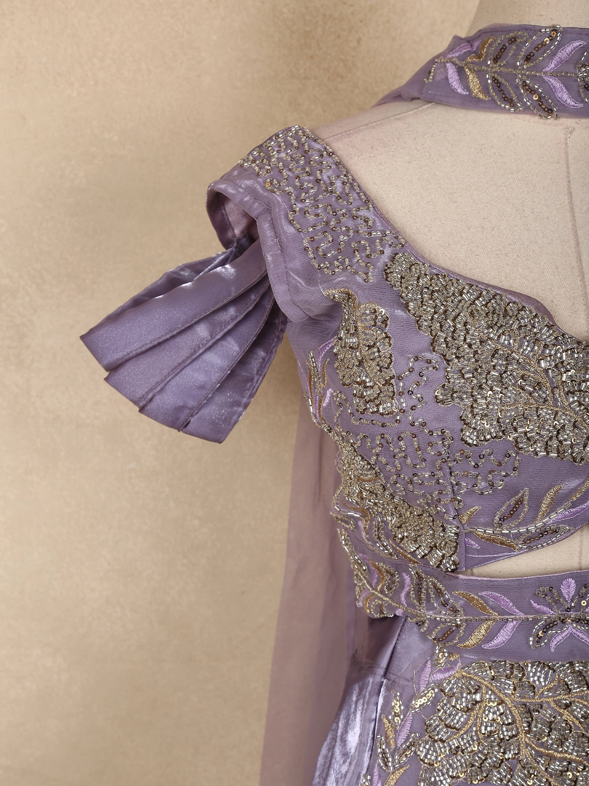 The blouse features exquisite sequin and bead embroidery, intricately woven into delicate floral patterns, elevating the elegance of the pastel lavender base. Designed with a sweetheart neckline and pleated short sleeves, it perfectly balances modern finesse with regal grace. The highlight of the lehenga is its 3D floral detailing on the skirt, exuding couture artistry and adding a statement-making finish.