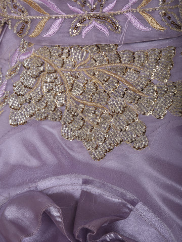 Step into the spotlight with this Lavender Sequins Embroidered Organza Bridesmaid Lehenga, a dreamy creation that radiates poise, sophistication, and timeless charm. Crafted from luxurious organza, the ensemble glistens with a soft sheen, while the structured flared silhouette adds an ethereal dimension to your bridesmaid look.