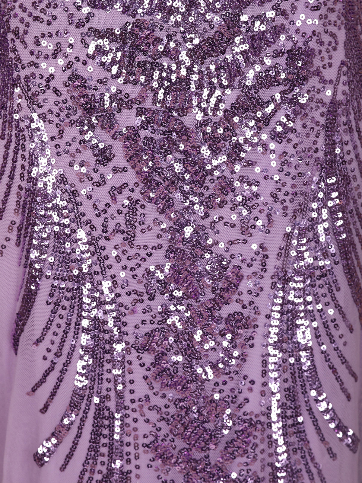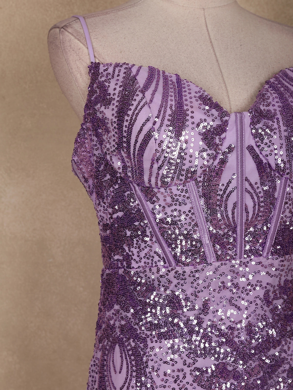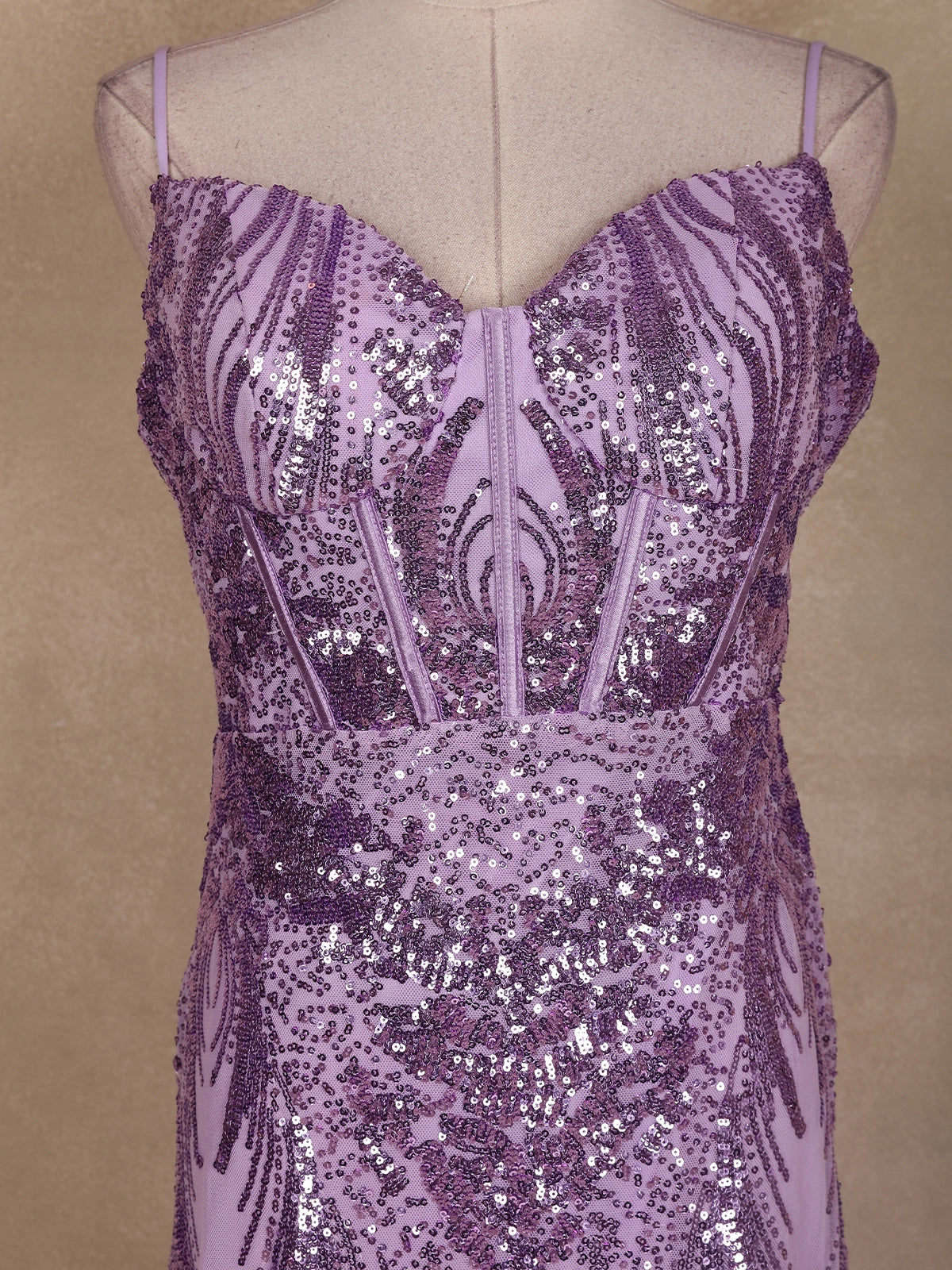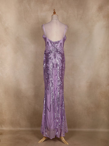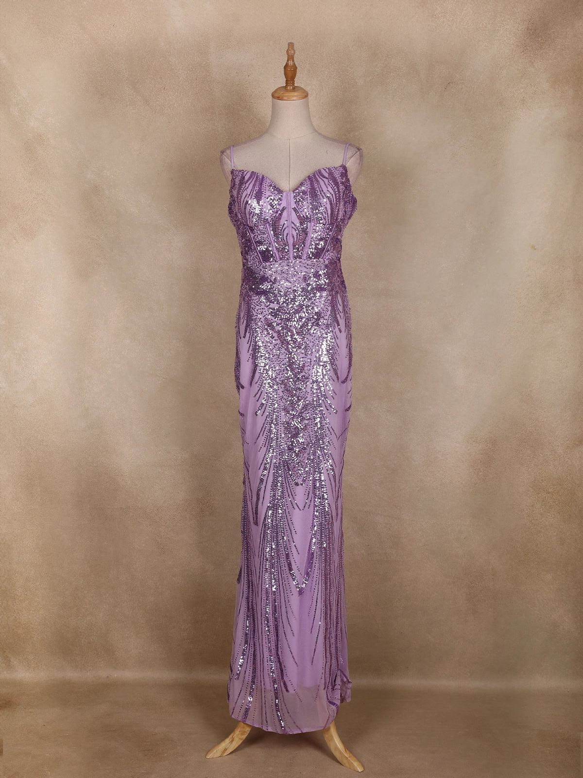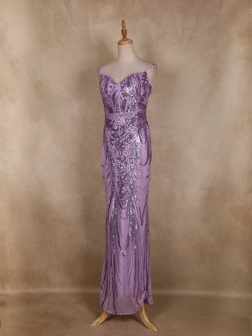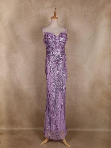 Grace meets glamour in this captivating lavender mermaid gown, crafted to make every moment shine. The body-hugging silhouette features all-over sequin embroidery in intricate linear and abstract patterns that cascade beautifully down the length, creating a mesmerizing shimmer effect. The sweetheart neckline with delicate spaghetti straps adds a touch of romantic charm, while the sheer mesh detailing enhances its ethereal appeal. The back features a deep U-cut design, ensuring elegance from every angle. Perfect for evening receptions, cocktail parties, or red-carpet occasions, this gown promises a head-turning presence.