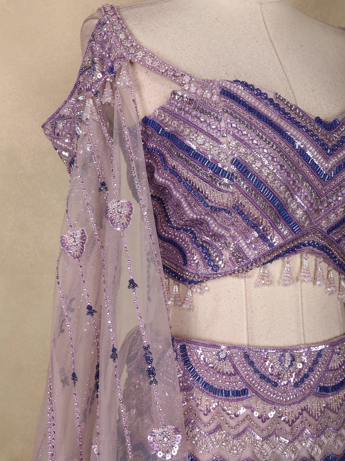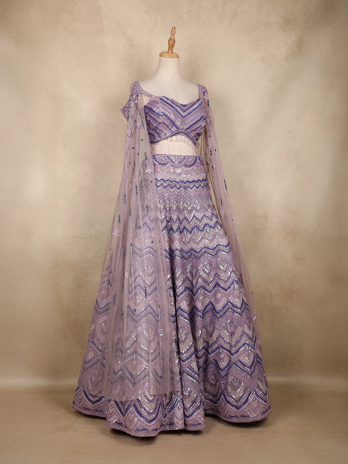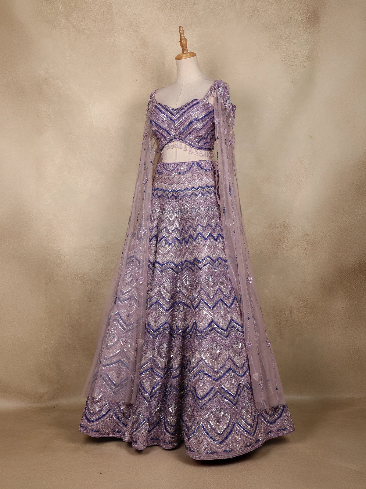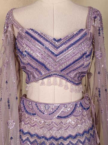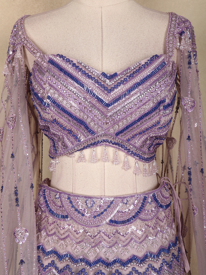 Lavender Sequins Embroidered Net Lehenga Set with Cape Sleeves