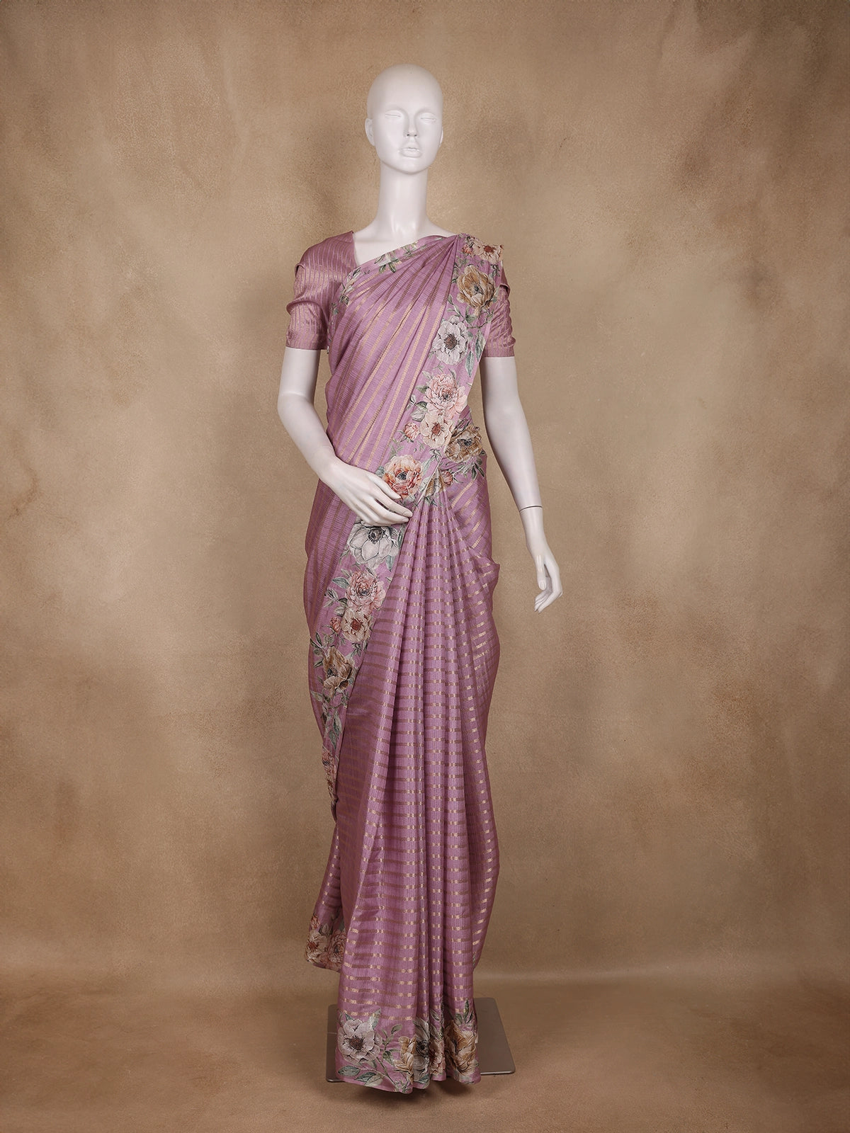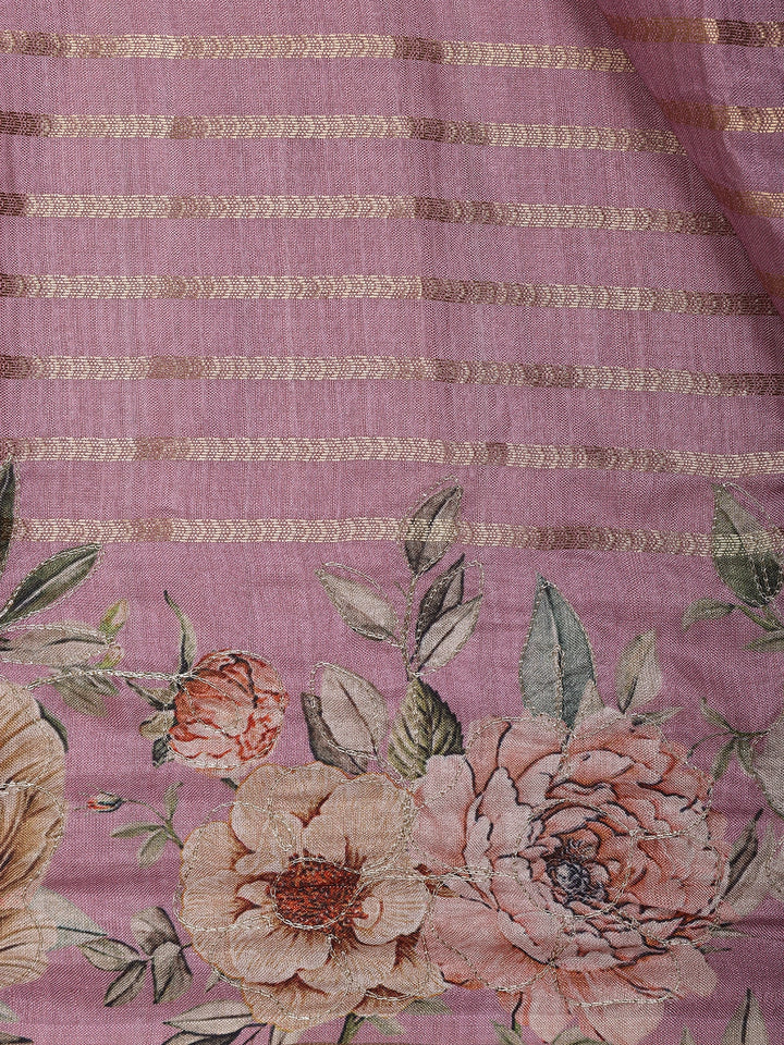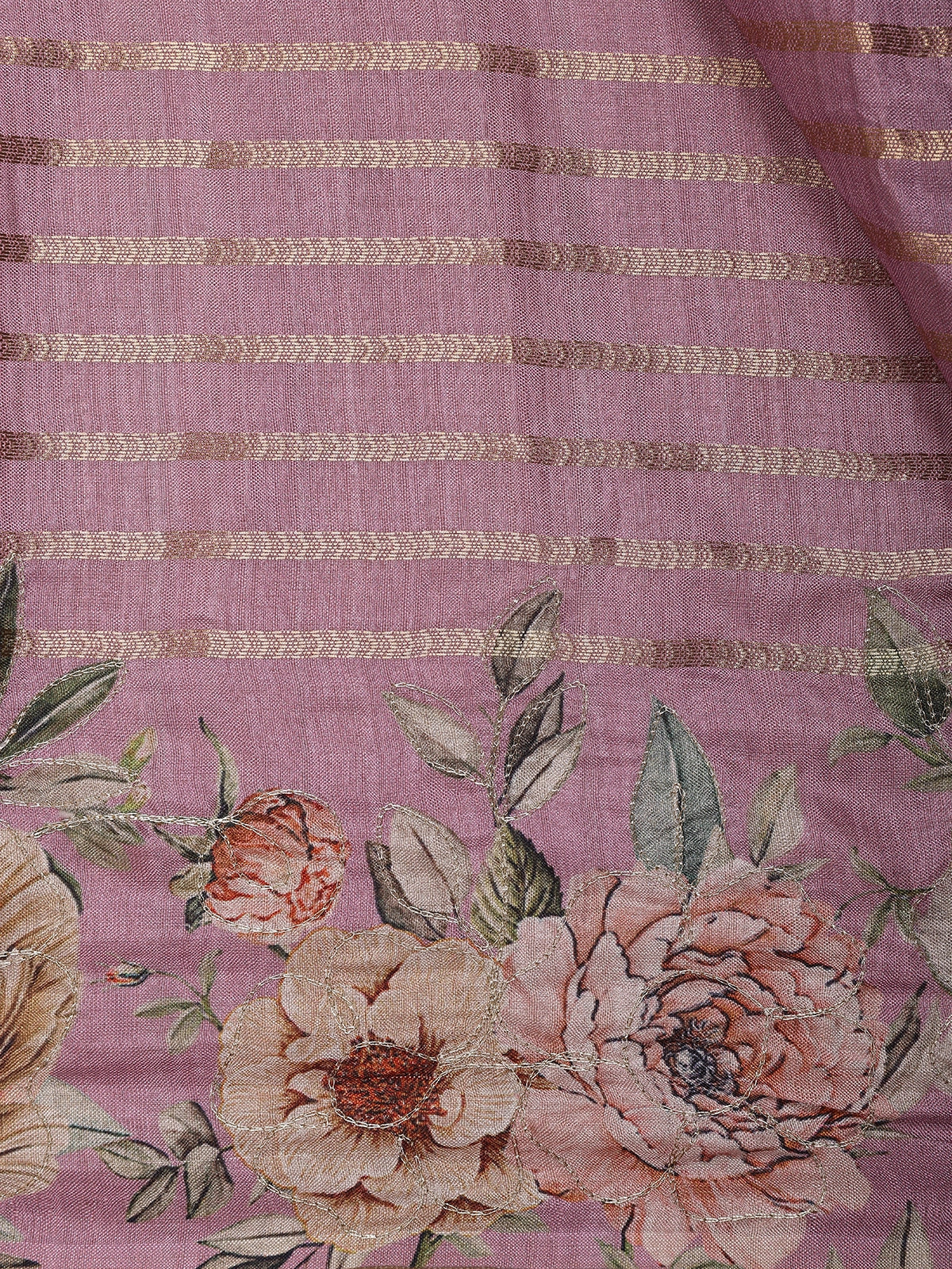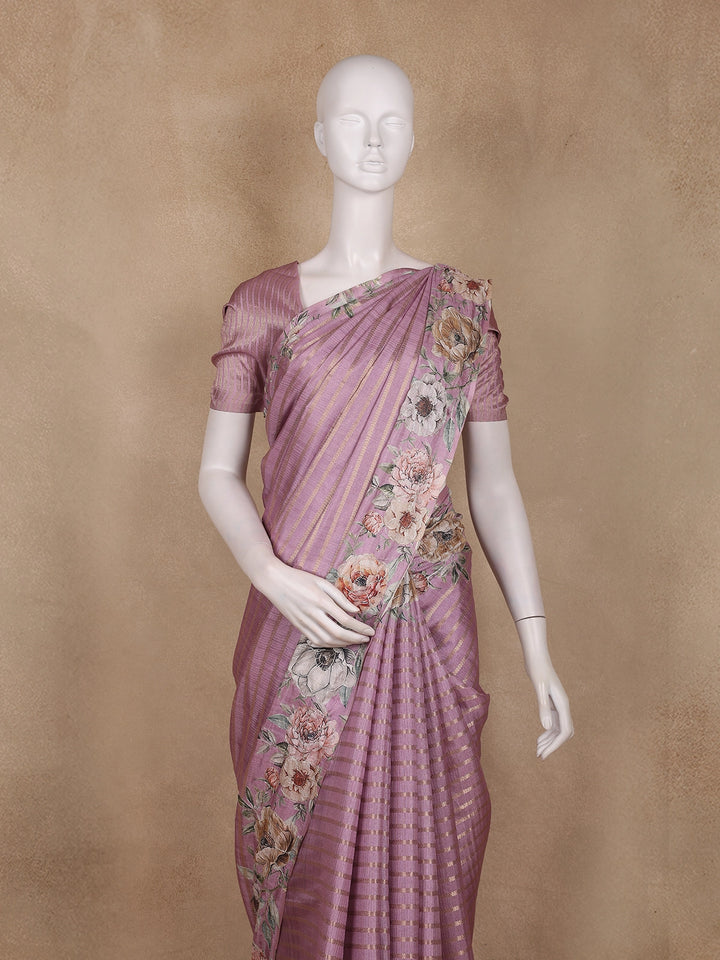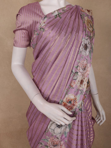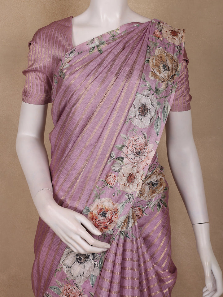 Lavender Stripes And Floral Printed Tussar Silk Saree